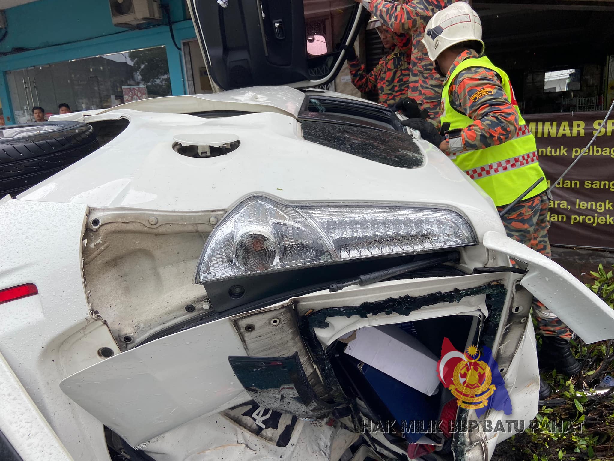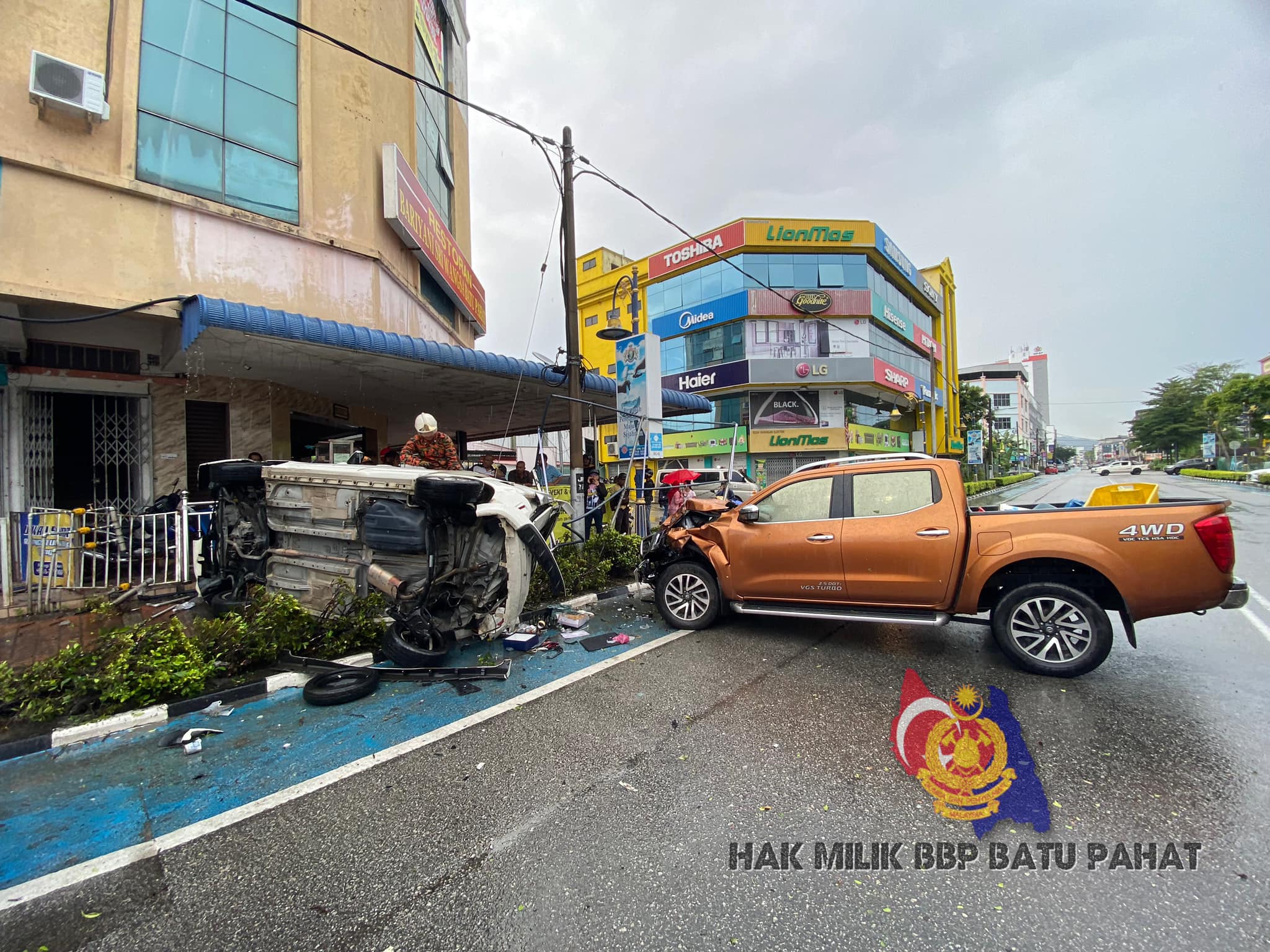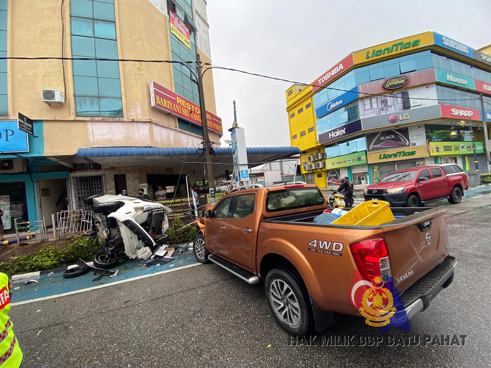 从峇株巴辖消拯局发布的图来看,车祸涉及2辆轿车,其中白色轿车撞倒灯柱和围栏,且侧翻倒在一间店前。橙色的四驅車则车前毁凹。