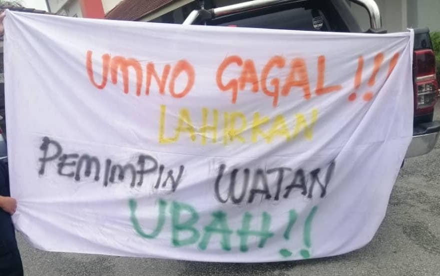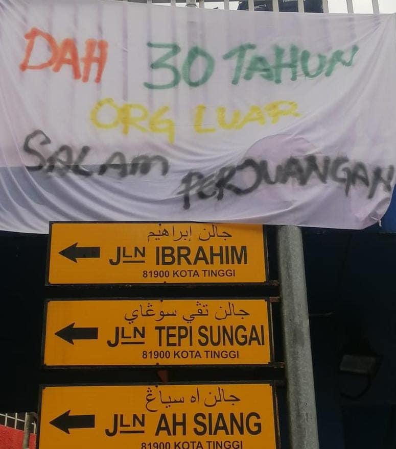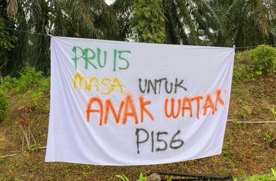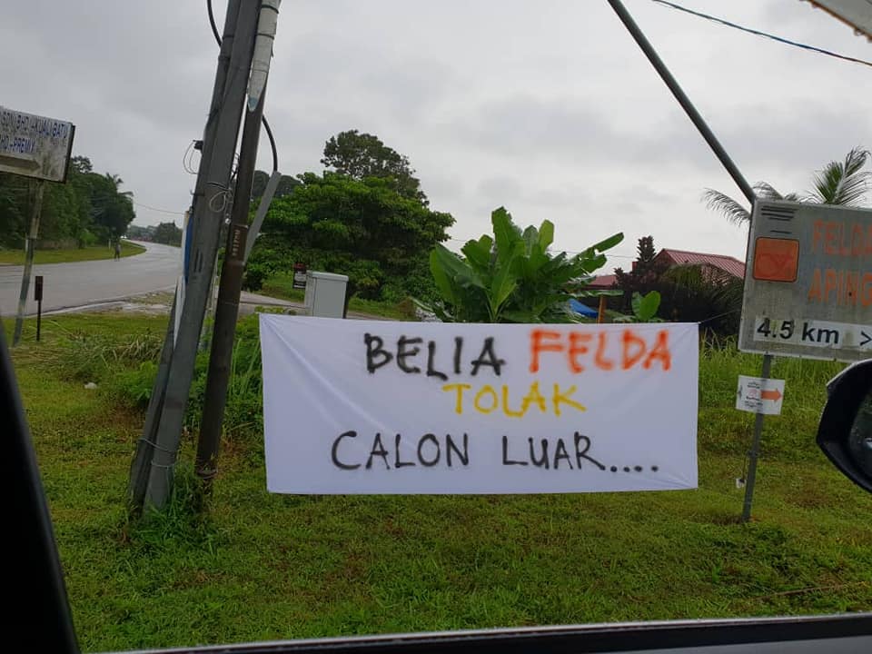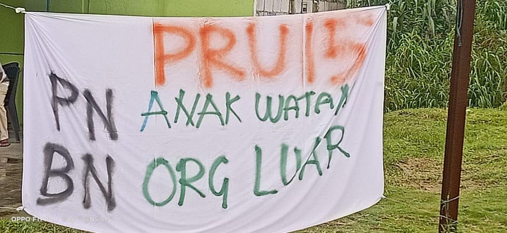 有关布条内容指第15届全国大选,垦殖区选民只要当地人,不要外来人,另有布条点名国阵的外来人,国盟是当地人。