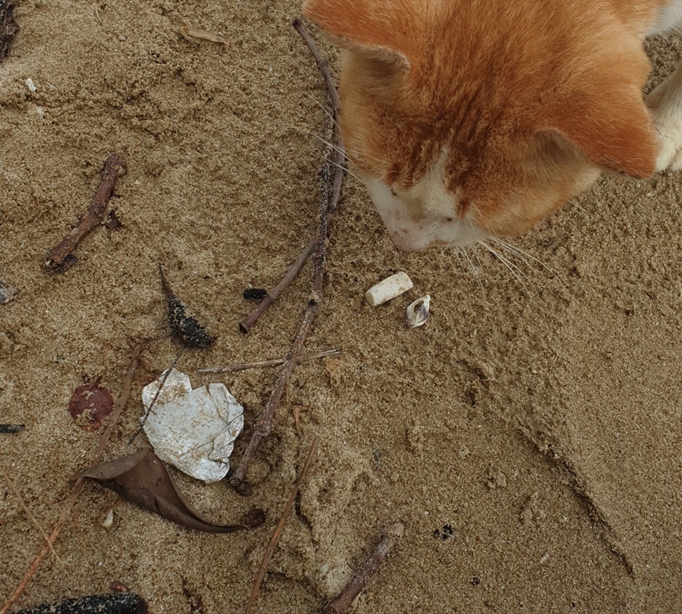 日前,在Penyabong码头的清洁运动上,有2名成人、5名孩童和1只猫共同完成任务。
