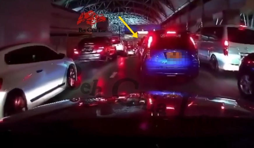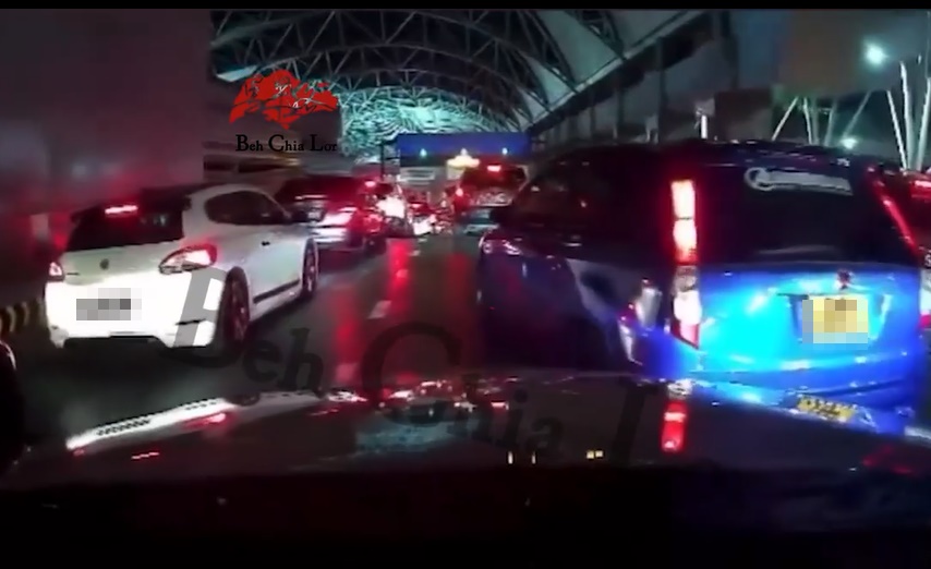 面子书流传视频,前日在柔佛长堤关卡处,因为非常拥堵,不少轿车都换车道,一辆轿车的女司机更被多辆轿车“插队”。