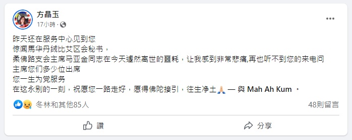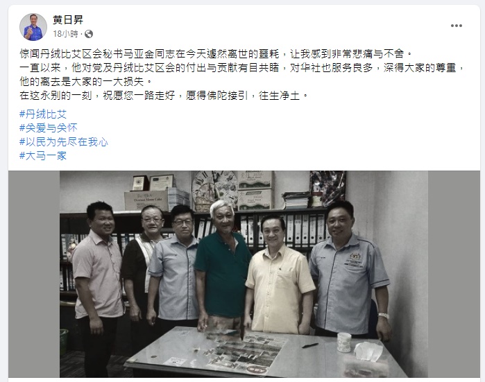 马华北干那那州议员陈勇鸣留言:“马大哥你的离开让我们非常震惊与痛心,谢谢您一直以来对党对丹绒比艾区会的付出与贡献。