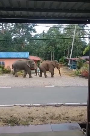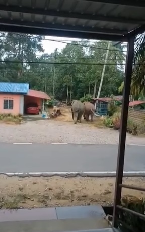 昨日流传在靠近加亨国小处,有两头野象结伴经过住宅门前的视频,只见两头野象悠哉闲哉,再走入树林。