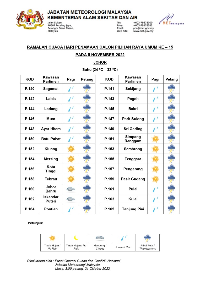 大马气象局预测,第15届全国大选提名日(5日),15个有雨的国会选区有:昔加末、士基央、拉美士、巴莪、礼让、峇吉里、麻坡、巴力士隆、亚依淡、四加亭、峇株巴辖、埔莱、古来、笨珍、丹绒比艾。