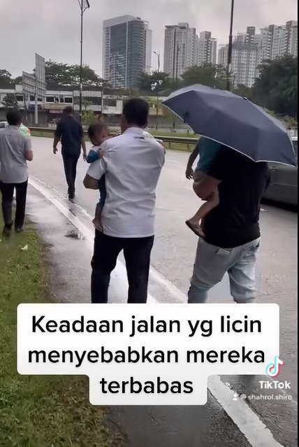 (新山6日讯)柔佛州务大臣拿督翁哈菲兹看见车祸发生,立即停车援助,甚至帮忙狠狈抱着2名孩子的父亲,抱着其中一个娃,并让一家三口在车内避雨。