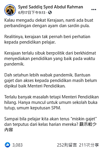 他说,新冠疫情爆发一年多,教育部长至今未能很好地处理教育问题,大多时间是“神隐”,出现时只是宣布学校关闭或运作,以及大马教育文凭成绩。