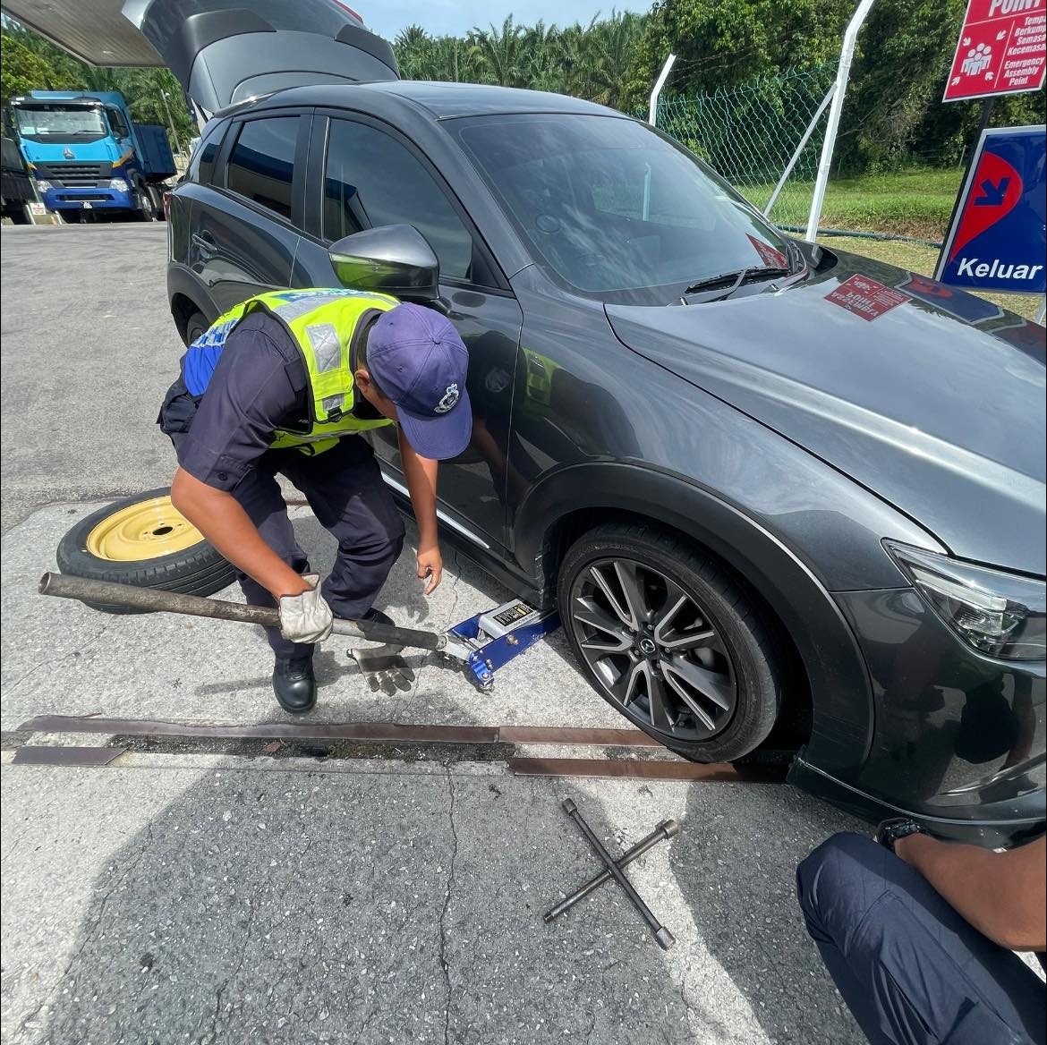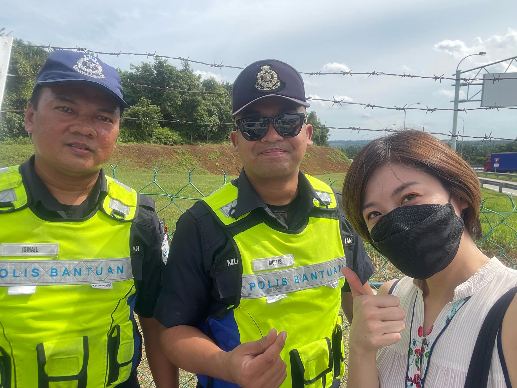 (笨珍19日讯)大马艺人罗忆诗开车返乡途中,在南北大道爆胎,庆幸遇上辅警协助换轮胎,安全抵达笨珍准备今日投票。