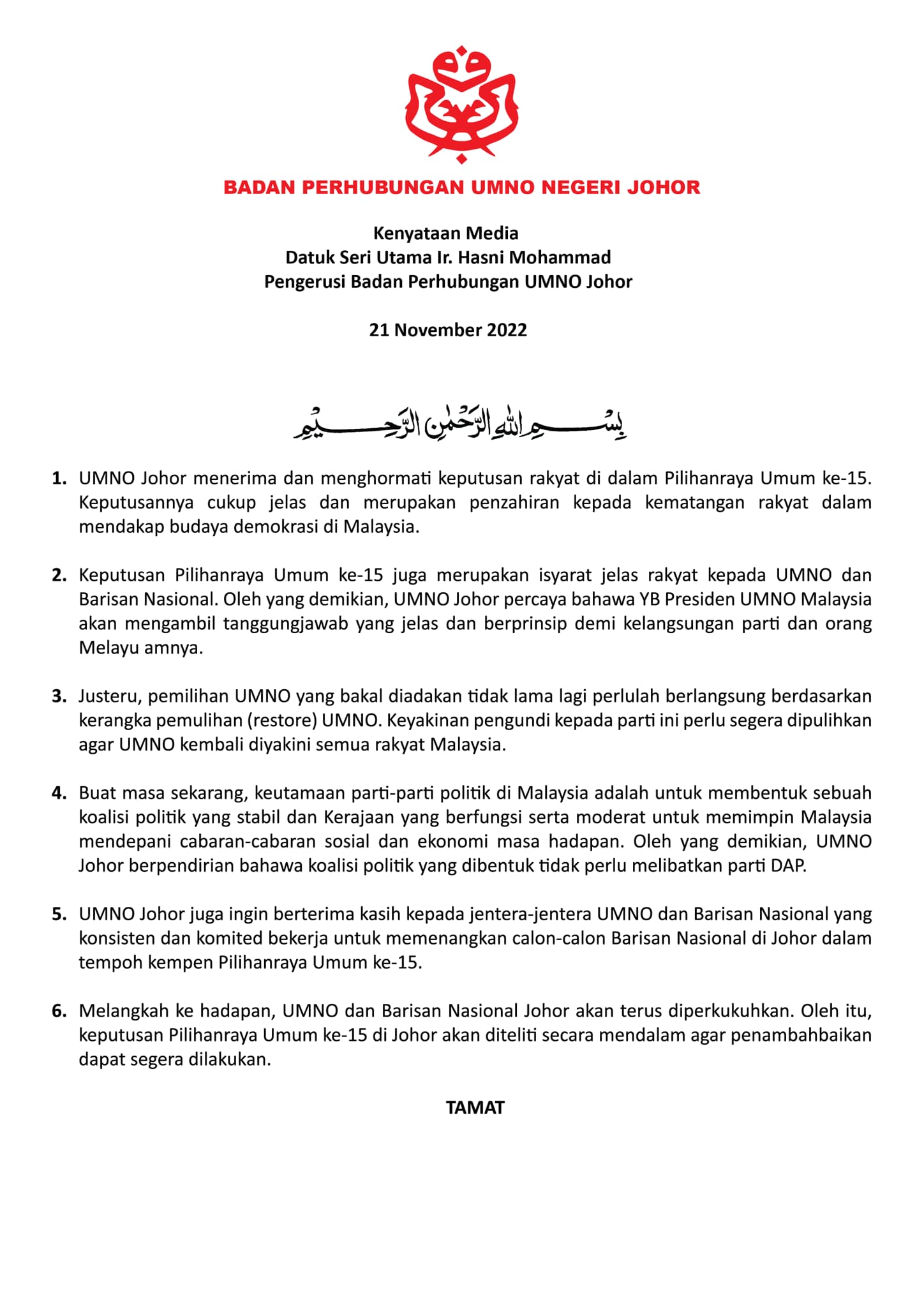 巫统柔佛主席兼新邦令金候任国会议员拿督哈斯尼,今日代表柔佛巫统发出文告。