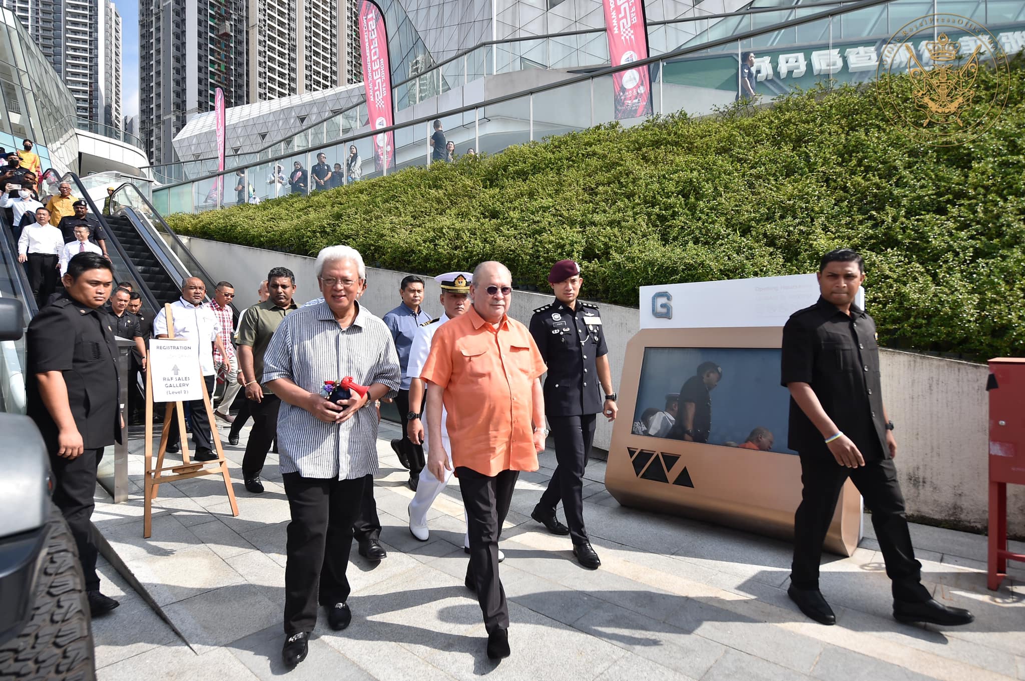 柔佛吉普赛主俱乐部主席拿督Md Othman Yusof 和富力集团马来西亚公司董事长李明亮等人,陪同陛下来到全新的码头,俯瞰富力集团位于柔佛海峡的开发项目。