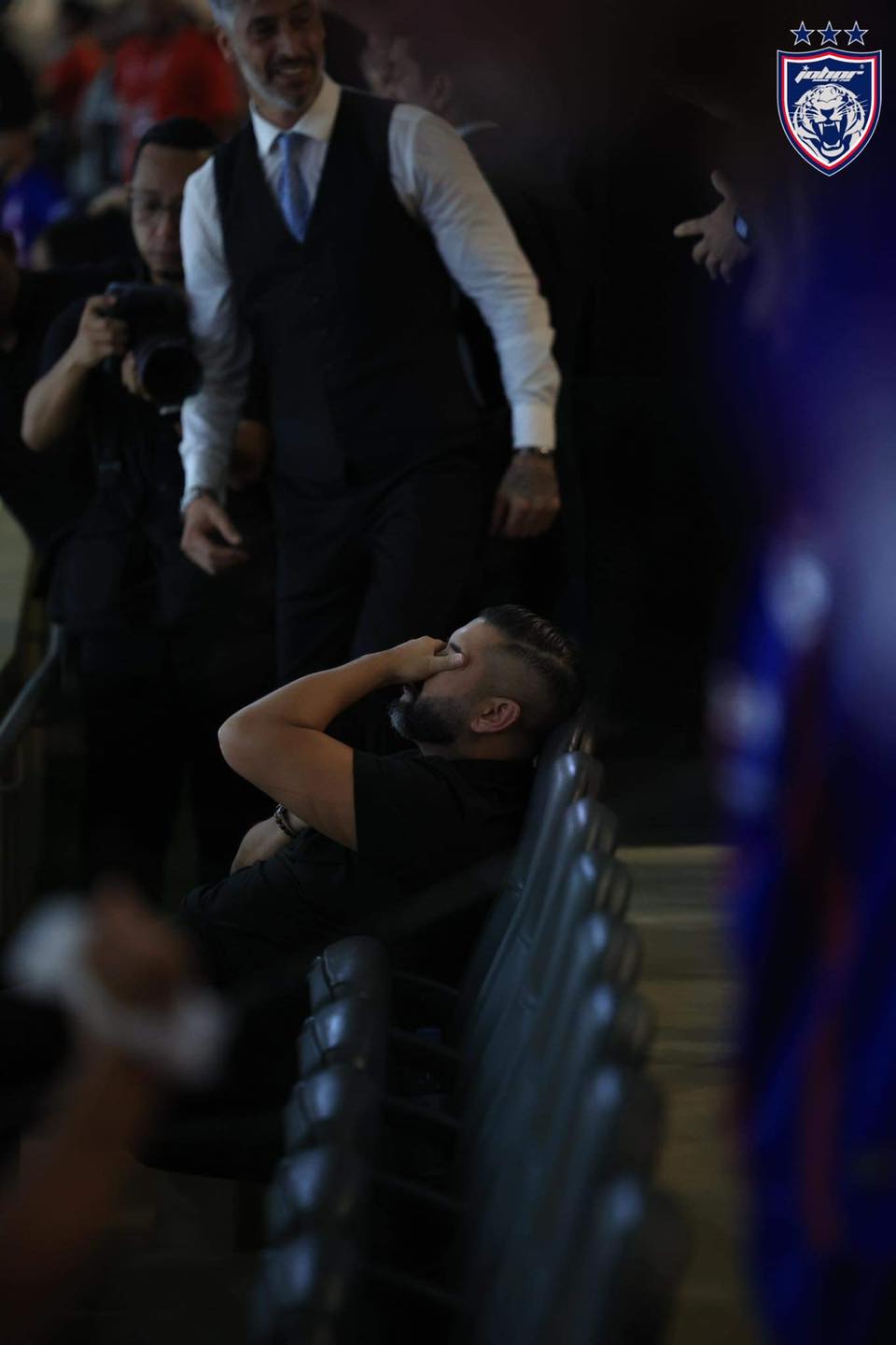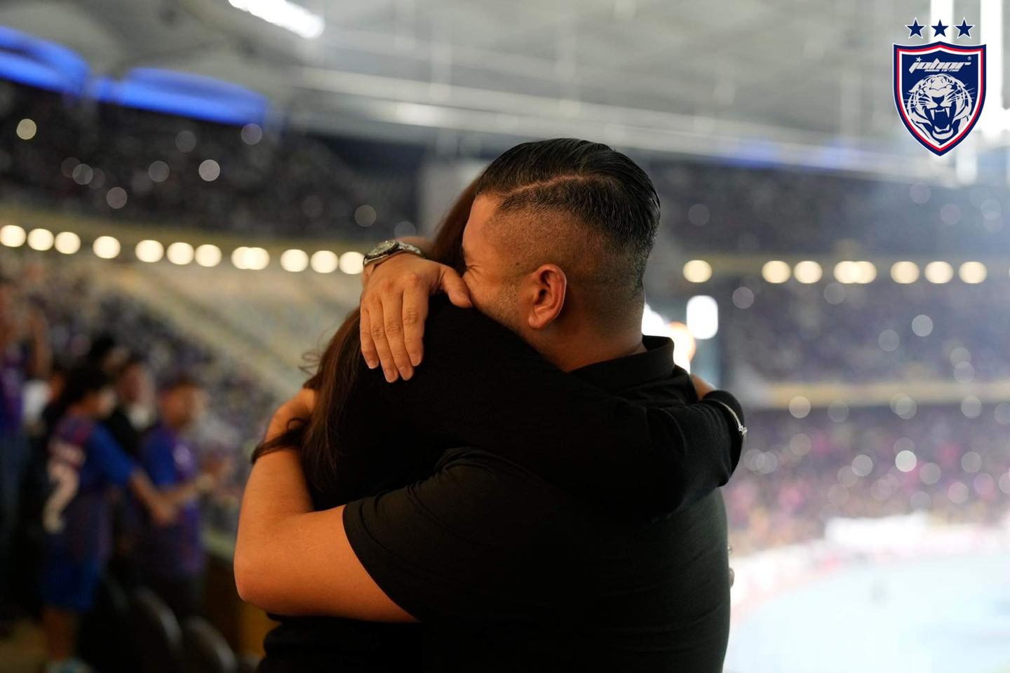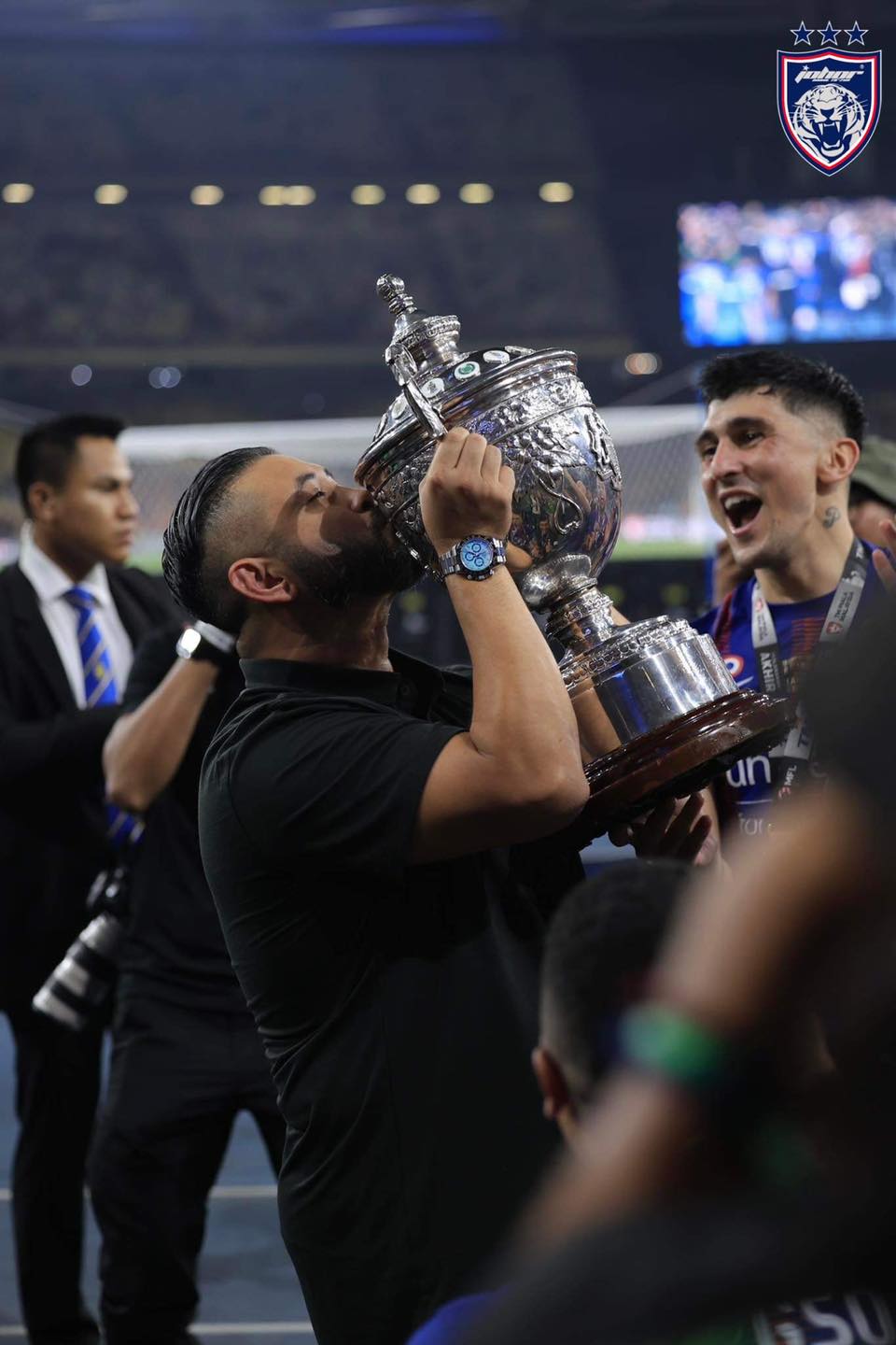 (吉隆坡27日讯)柔佛王储亲睹JDT再战一城夺杯,创下国内赛事不败纪录,百感交集,激动拥妻吻杯!