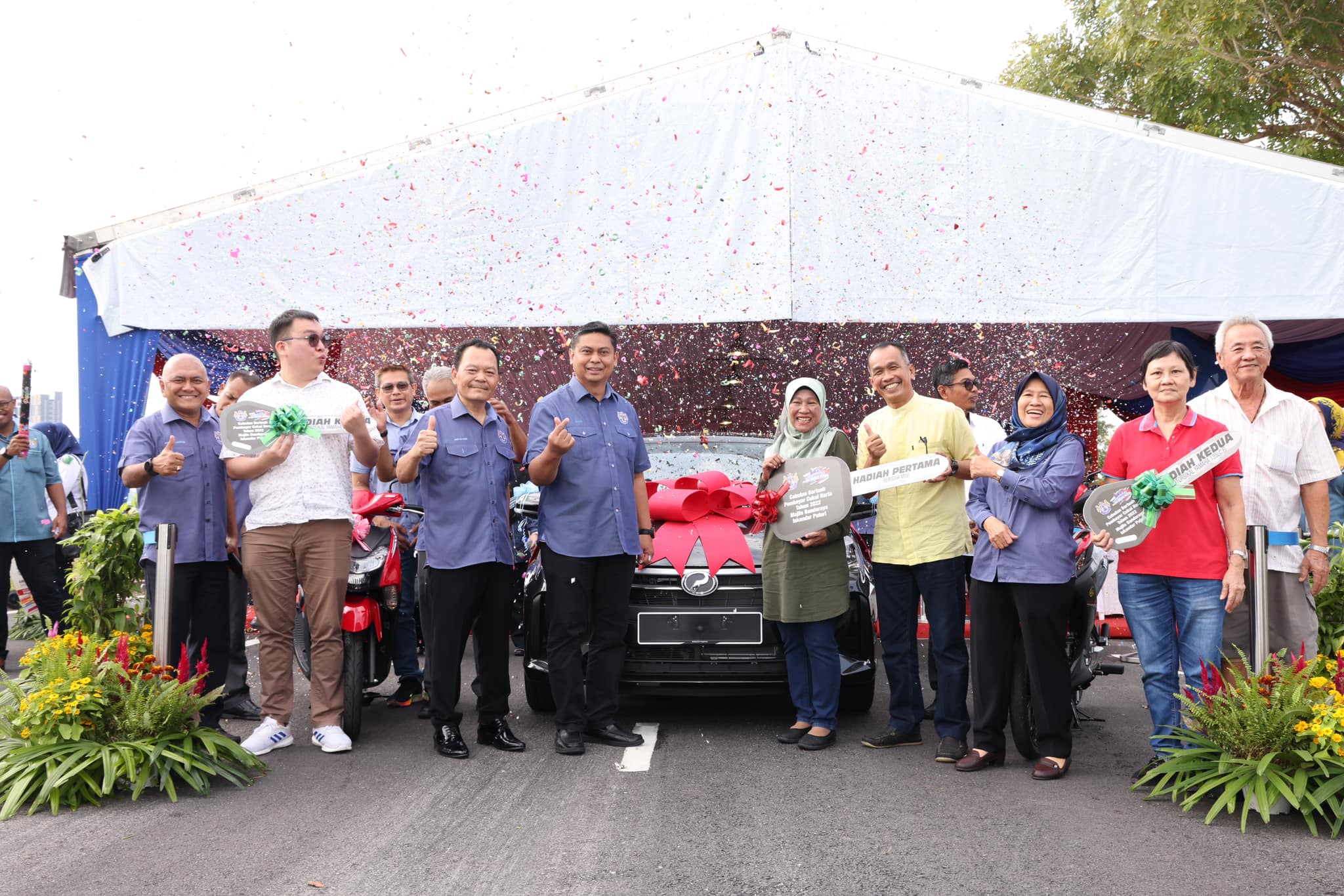 (新山19日讯)按时还门牌税,巫裔一家喜获一辆“国民战车”Myvi,两名华裔屋主也获得二和三奖,把摩哆骑回家。