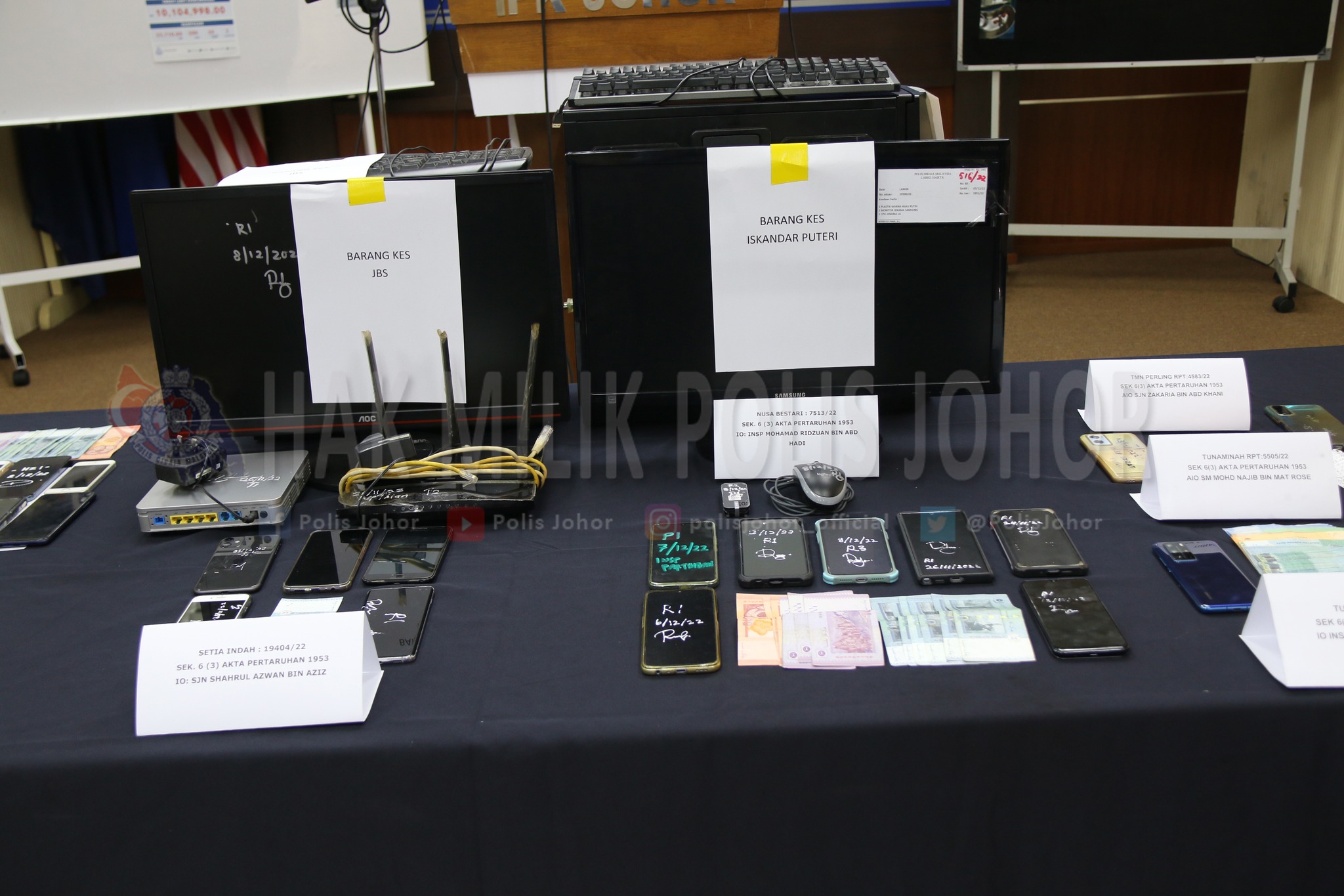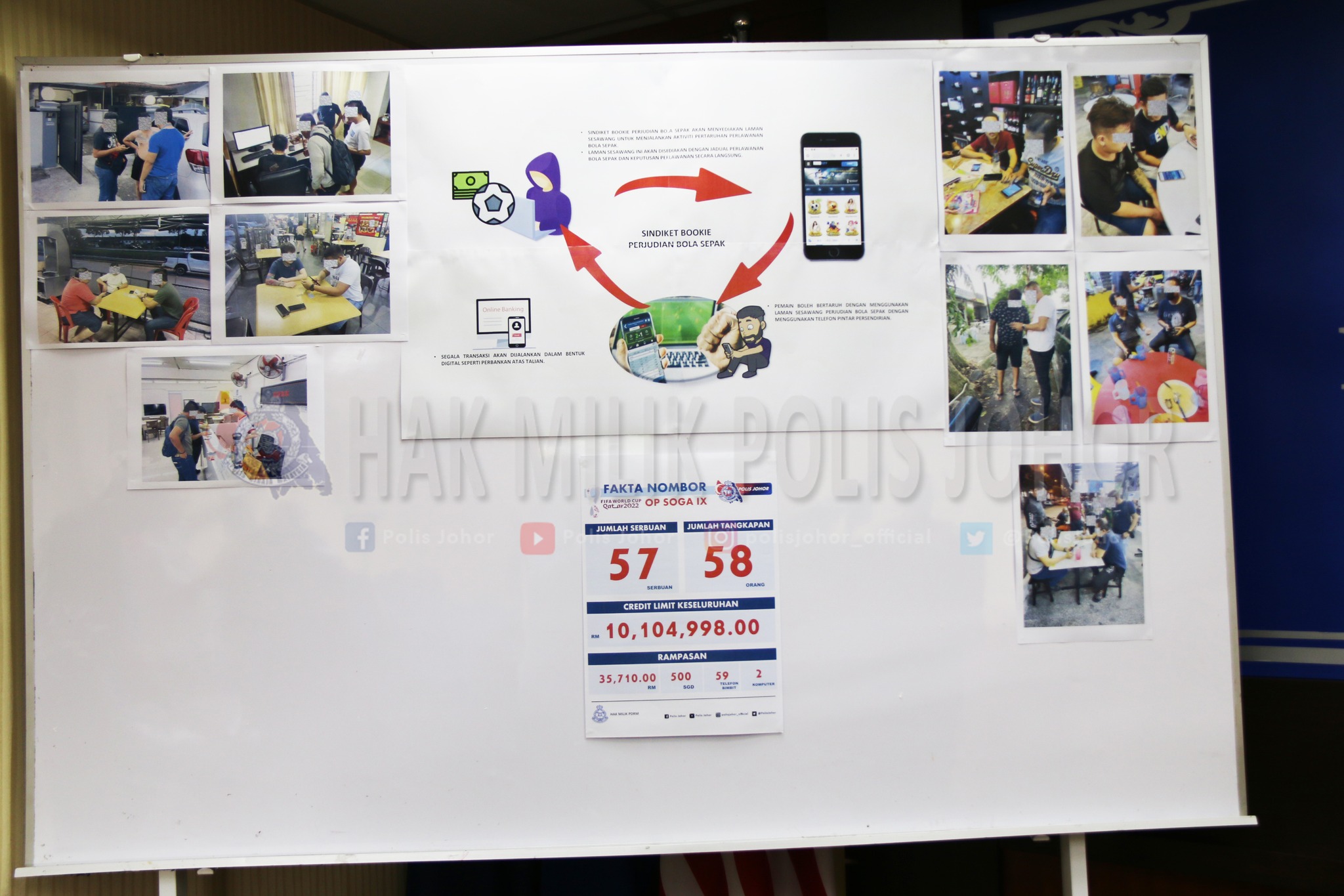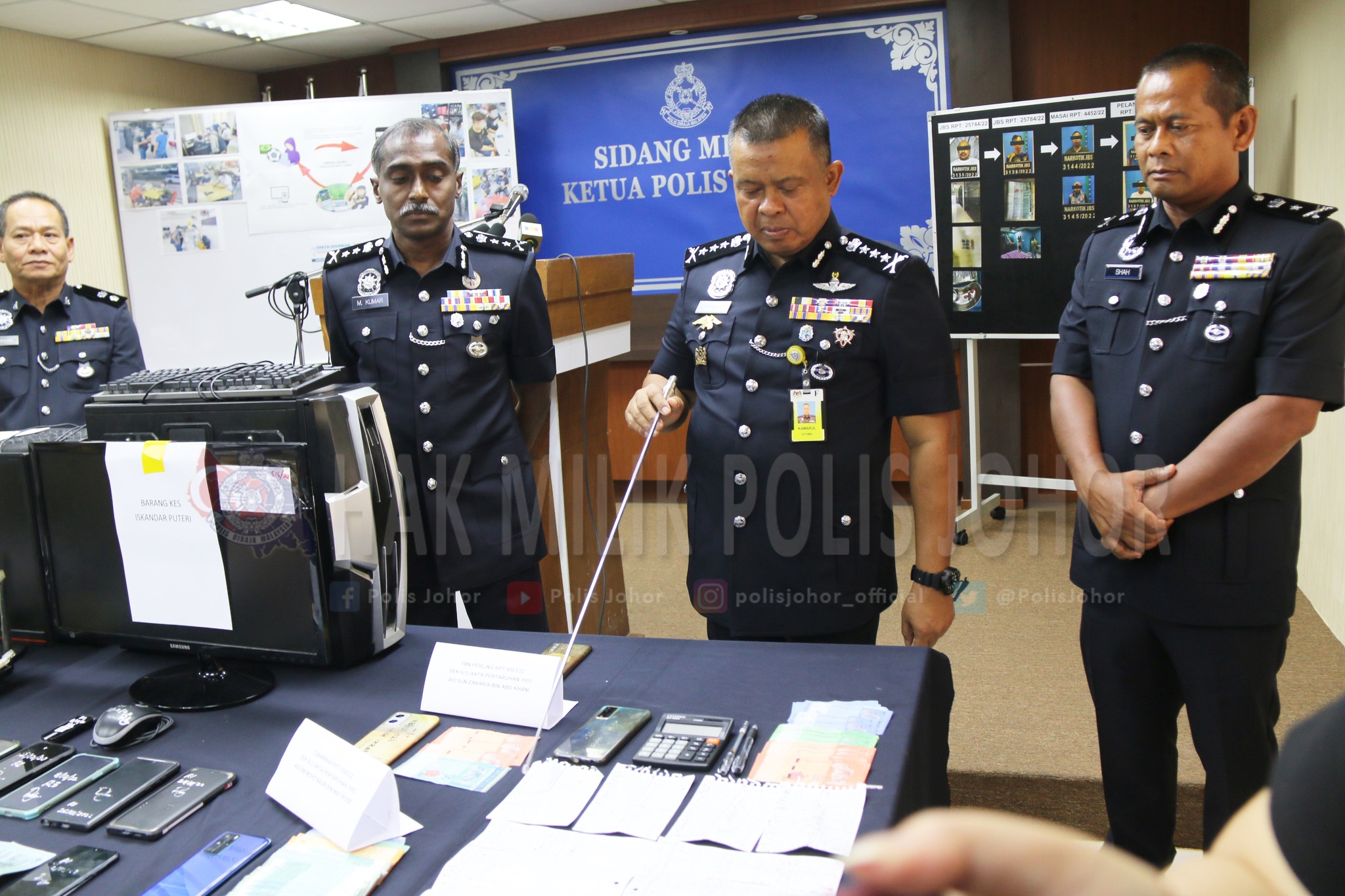 柔佛警察总长拿督卡马鲁查曼昨日在记者会上,公布11月21日至12月18日期间,第9次反赌球行动( Ops Soga IX )的成果。
