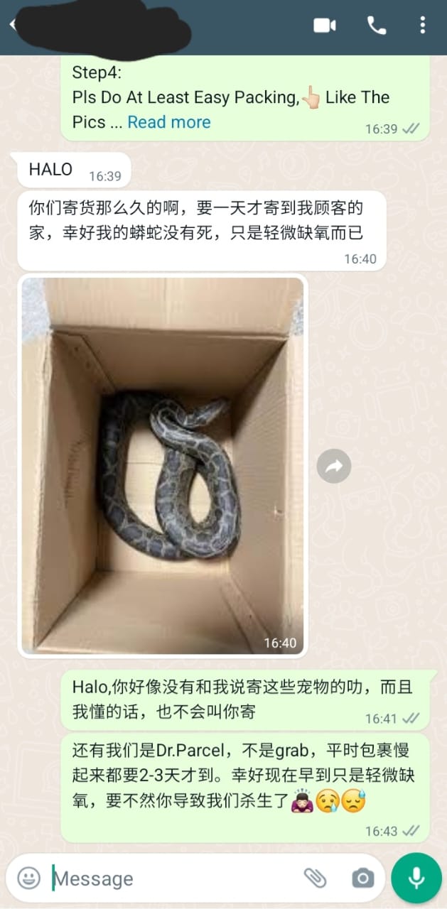 顾客邮寄蟒蛇,责怪快递公司一天才寄到,造成包裹里的里宠物蛇险些缺氧死掉。结果快递公司客户回复:“我们不是Grab!”
