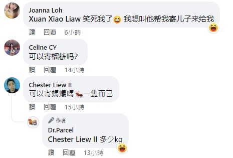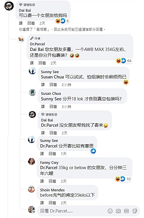 有的想邮寄女友,Dr.Parcel 小编回应一包裹限35公斤,女友是否要分装,更提醒结交35公斤以下的女友,多半要吃牢饭。