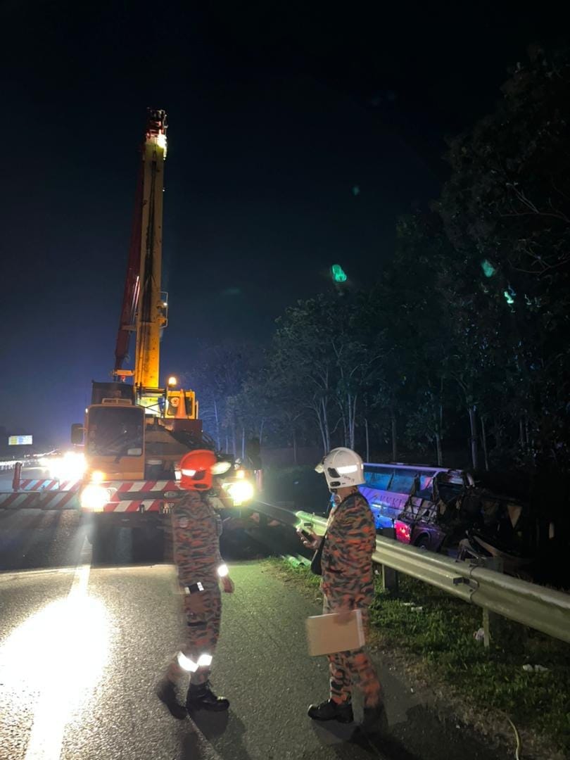 这起死亡车祸在南北大道32.公里处朝北方向发生,柔佛消拯局于昨晚10时17分接获投报,便在 Fairuz Helmi指挥官率领下,携同22名古来和士姑来消拯员前往救援。