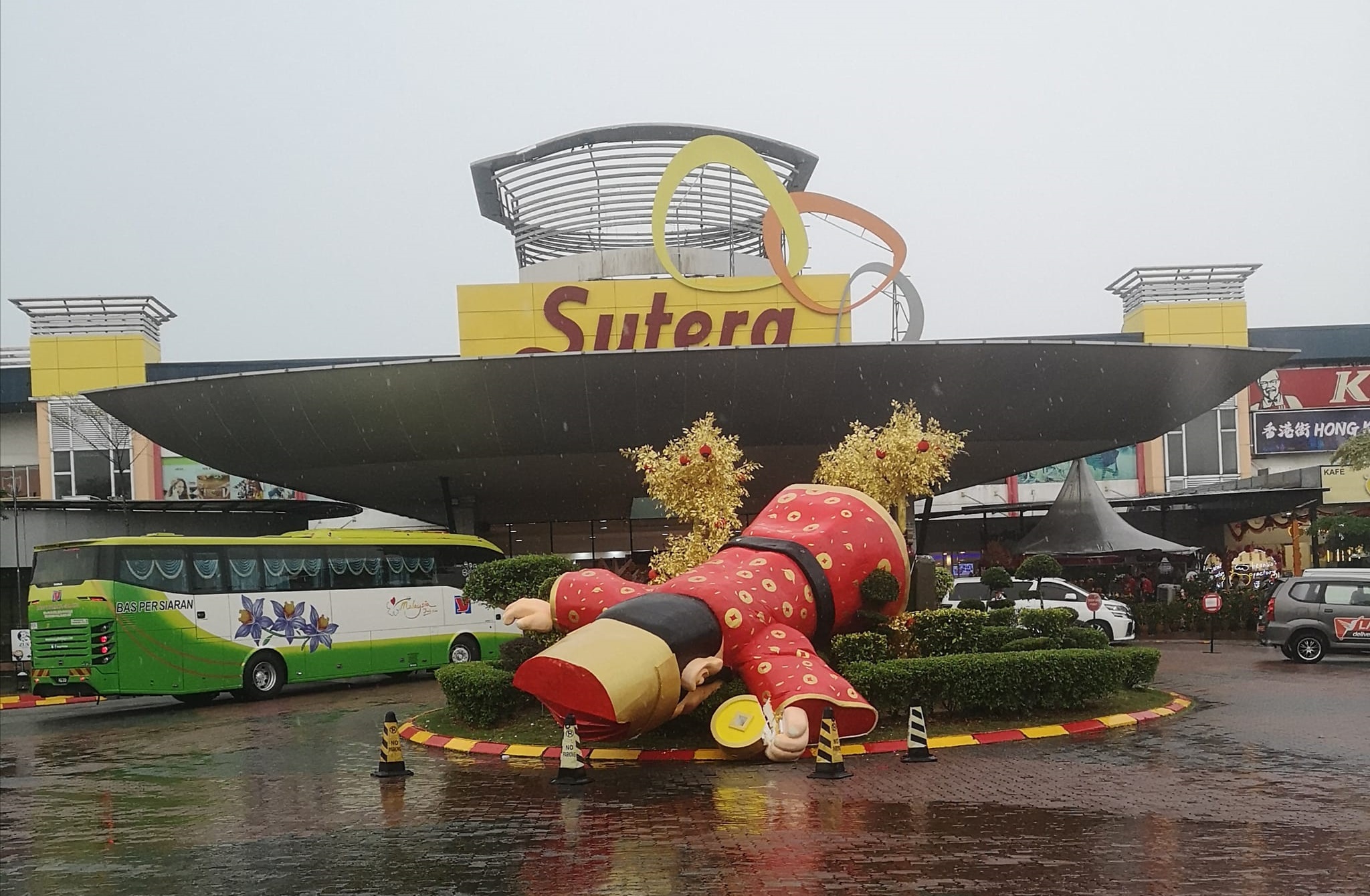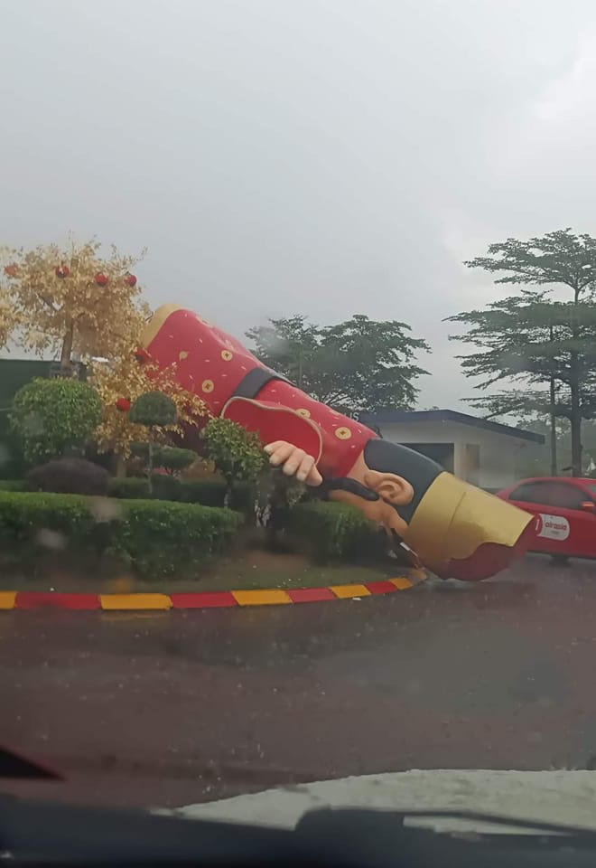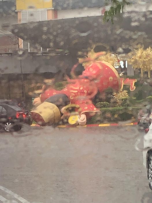 今午约2时,新山狂风暴雨,雷雨交加,滂沱大雨,雷声轰隆,闪电啪啦,位于五福城广场前的财神爷,受不至惊吓,趴倒了!