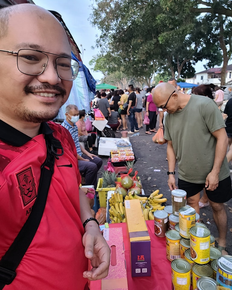 “报告老板,Yeo Tung Siong 杨敦祥 ,今天准时开鲍鱼档,就在香蕉,otak 档旁边。隔壁香蕉婆有派柑跟顾客拜早年,我们要跟吗?报告完毕!”
