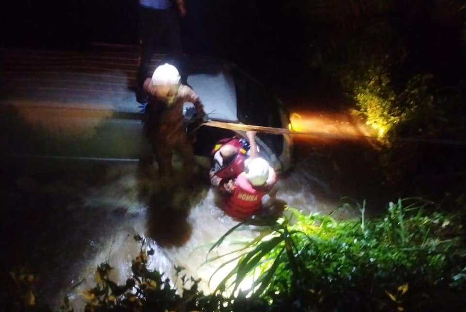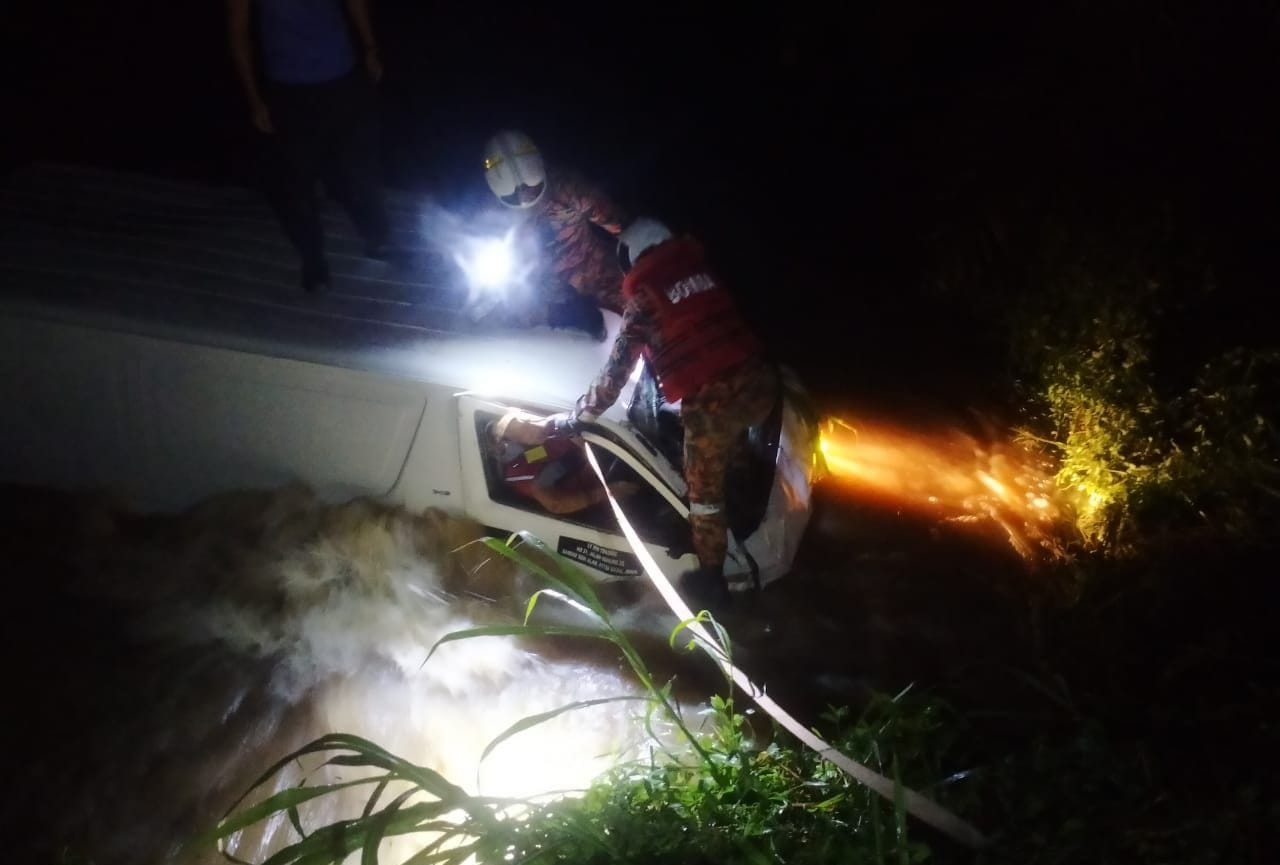 (峇株巴辖14日讯)客货车与轿车相撞,竟坠入大沟,消拯员在湍急的沟水将困着的司机救出。