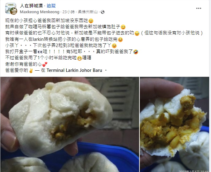 (新山6日讯)孩子亲自做包子,让越堤工作的爸爸填肚,爸爸不忍心告知“不能带包子进新加坡”,唯有入境前把包子吃光光,花1小时半吞了5粒包。