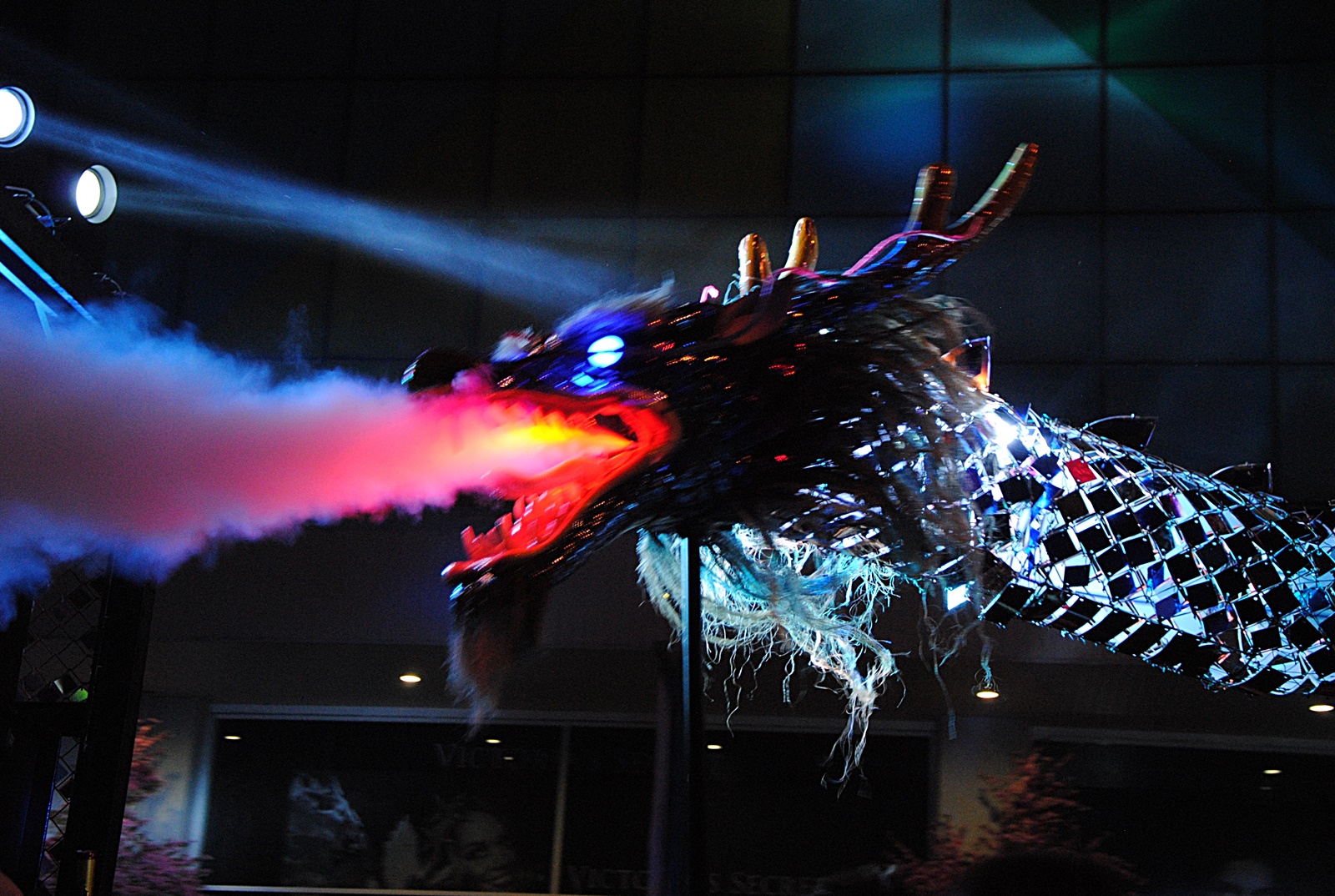 龙身由七彩球、藤环、铃铛、圣诞彩带和缝有亮片的布打造,一出场七彩缤纷,闪闪发亮。