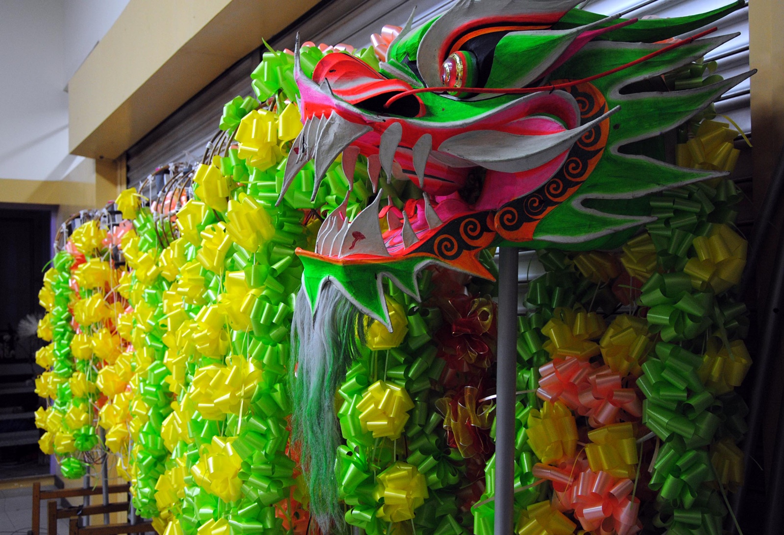 使用1068朵塑料玫瑰花作为龙身、56枝塑料桃花作为龙身上的背鳍、105片塑料叶子作为龙肚子,再用小叶子铺成龙裙。