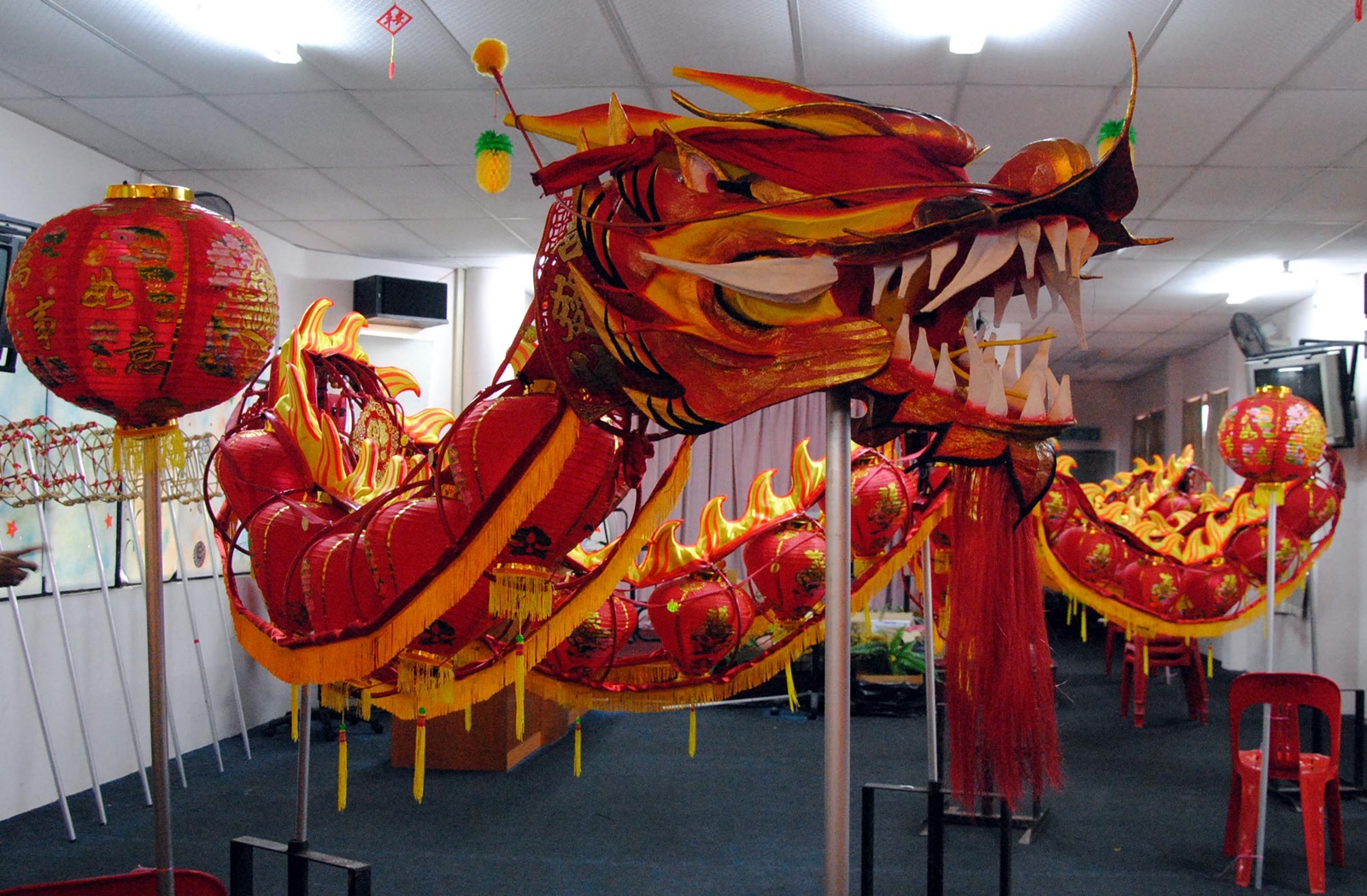 全长60尺,每节龙身共有4朵大红花、龙头3朵及龙尾两朵,加上龙珠上的一朵大红花,整条龙共有38朵大红花。