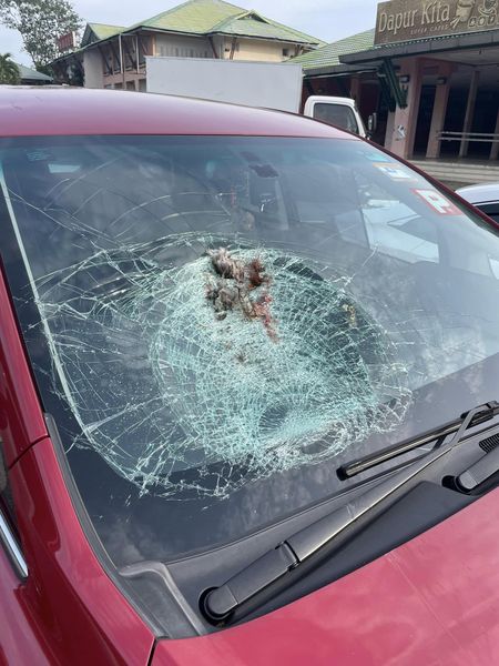 (新山11日讯)又一宗大道撞鸡事件!一只鸡突然飞出撞向轿车挡风玻璃,冲击力大到撞得粉身碎骨,司机被玻璃碎溅满身,庆幸只受皮外伤。