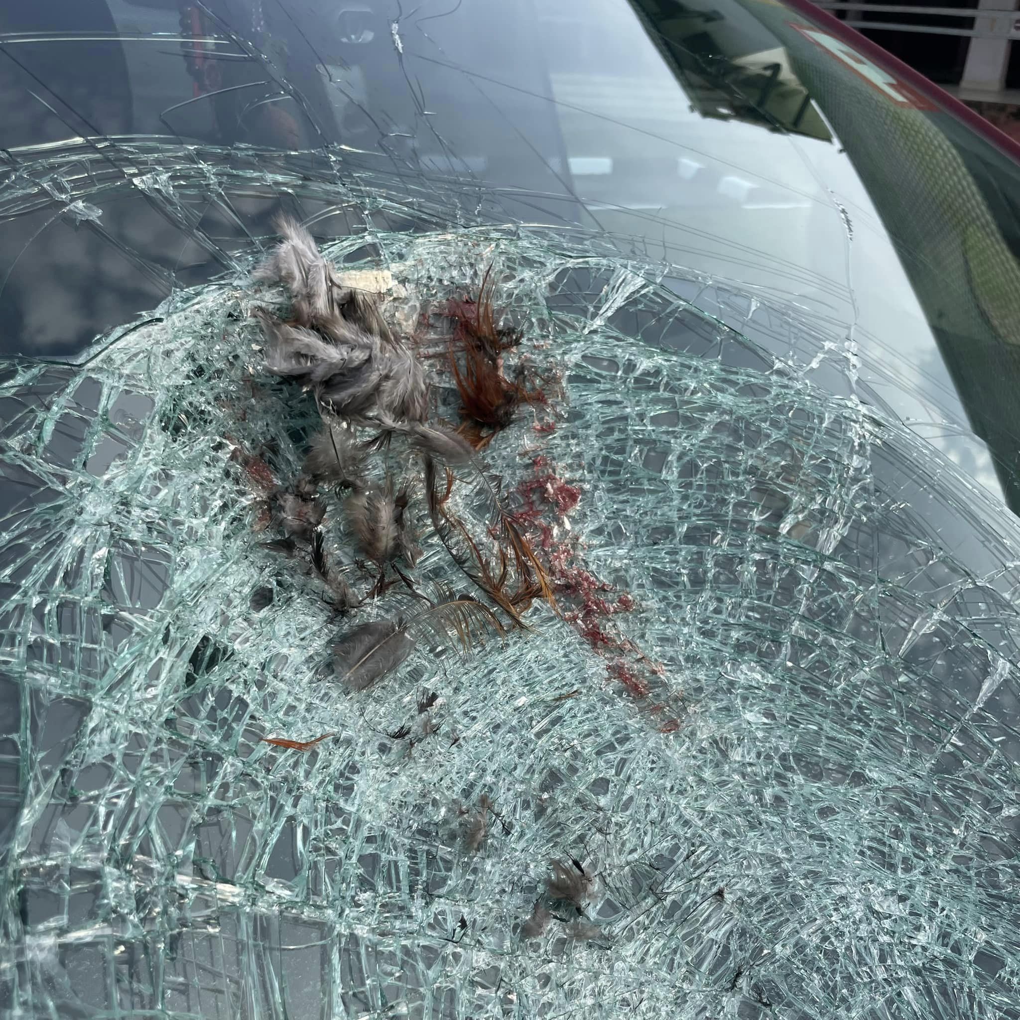 他下车检查后,发现挡风玻璃的鸡,除了鸡毛和几滴血,其他的什么都没有看到,好像已经粉身碎骨了。