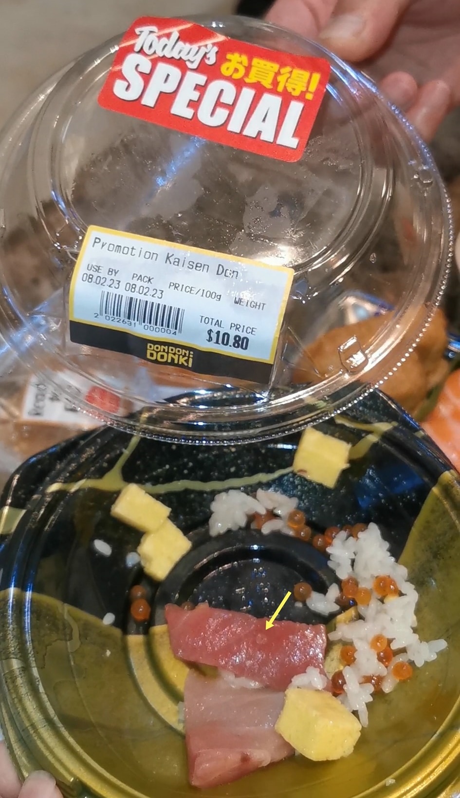 当两人愉快地享受着食物时,发现海鲜盖饭(Kaisen Don)的生鱼片上发现了“不寻常的东西”。