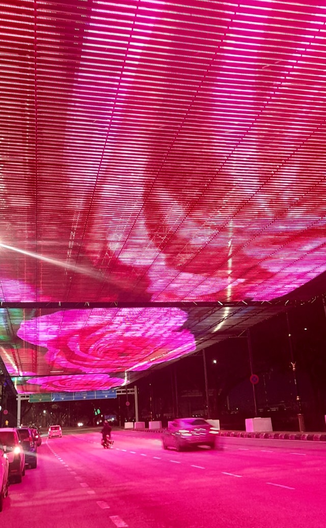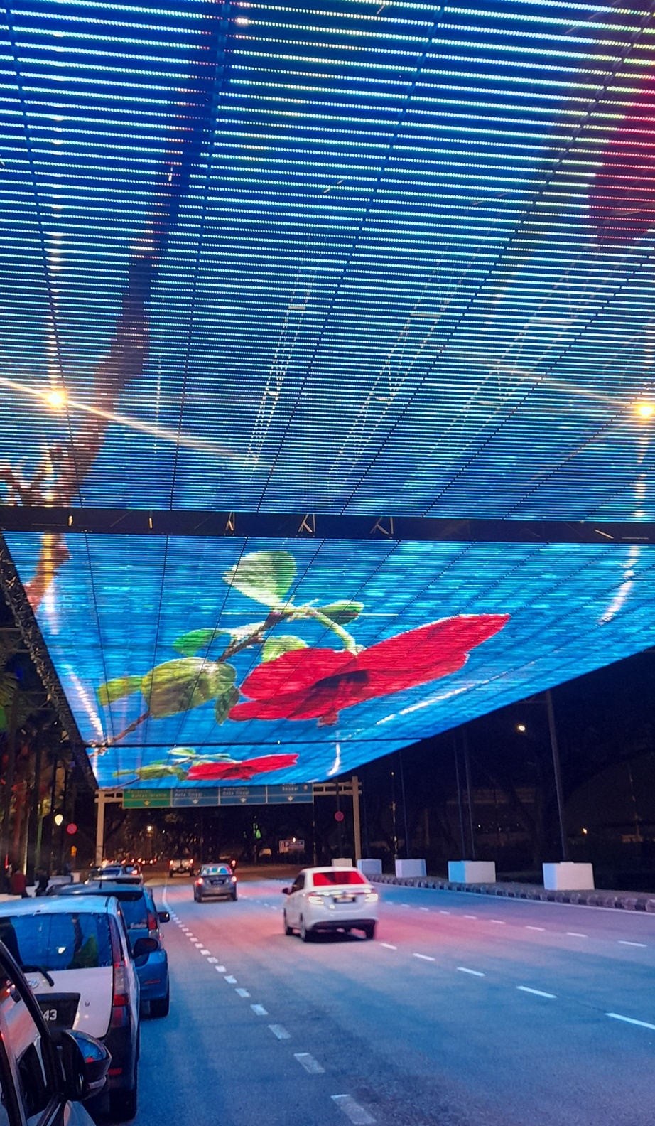 如果晚上到新山市区闲逛,不可错过这引人注目的“天空屏幕”,即使轿车从屏幕下驾过,也觉得很酷炫。