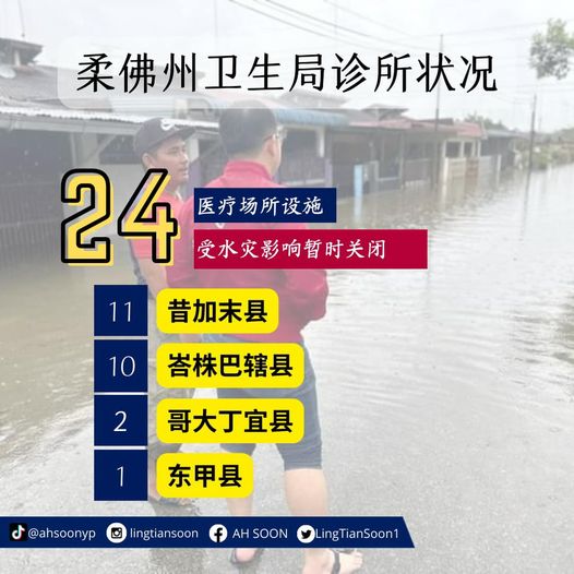 柔佛州卫生与团结事务委员会主席林添顺行政议员今日凌晨发文告指出,水患造成柔佛的部分医疗设施运作受影响。