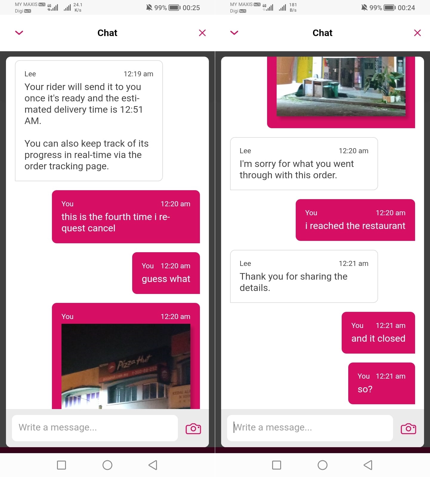 一直到了凌晨12时,他觉得客服欺人太甚,便亲自开车到有关Pizza hut,甚至拍了店面已关门的照片给客服,没想到客服竟说有些餐厅可能是闭门备餐。