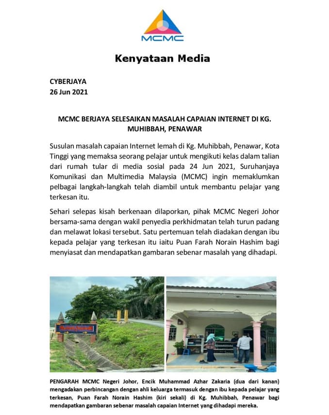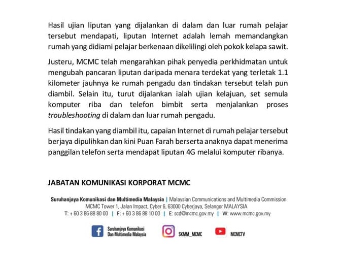 文告说,前日已有柔州通讯及多媒体委员会官员慕哈末和电讯服务代表前往现场了解,并拜会学生的母亲拉诺拉英指,调查后了解学生面对的实际情况,得知学生在屋家内外测试后,发现屋子因为被油棕树包围,造成网络收线差。