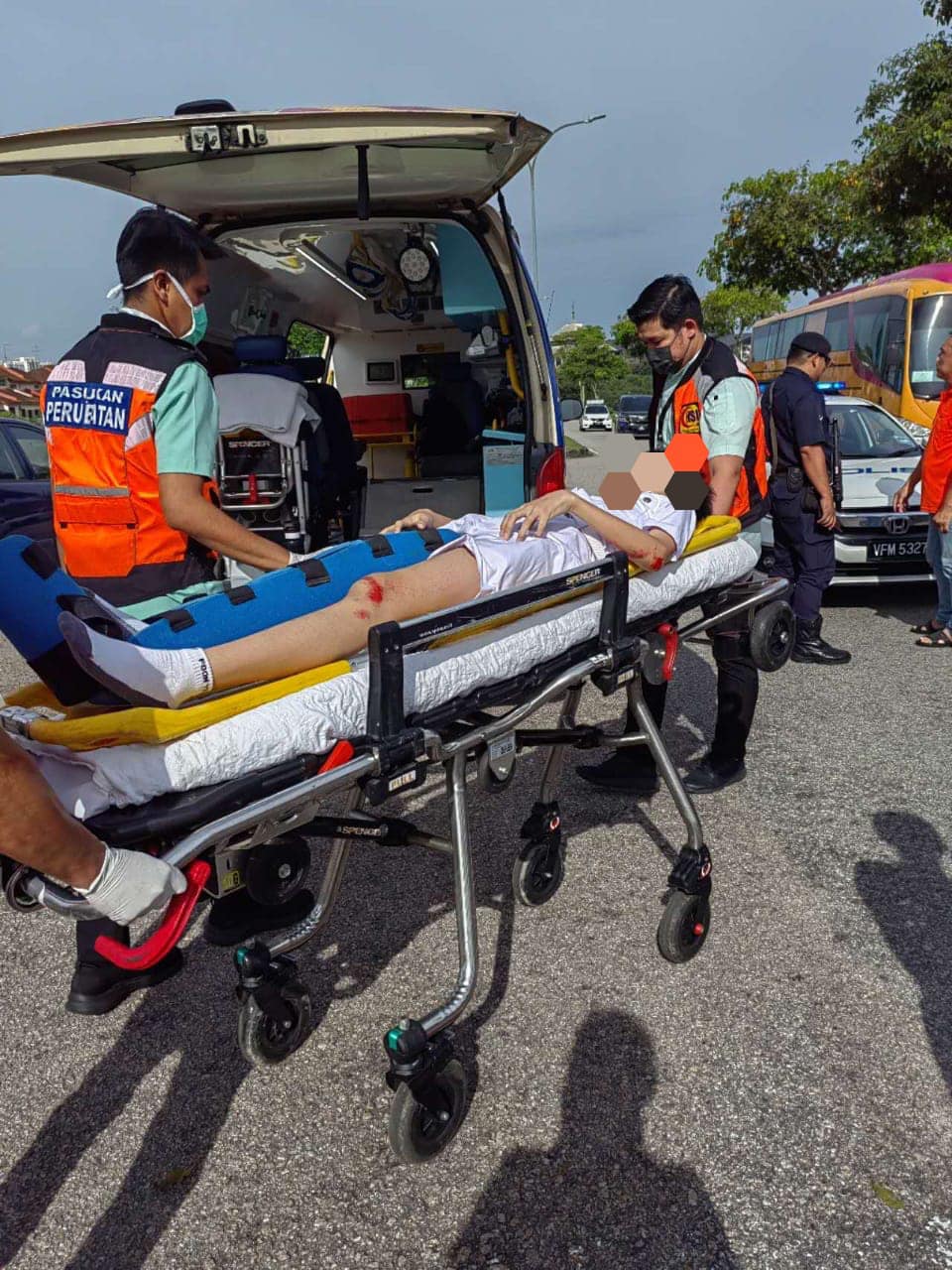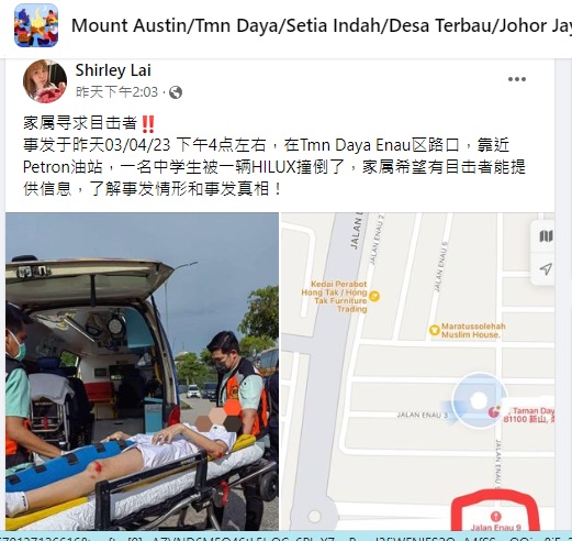(新山5日讯)宽中生疑被一辆货卡撞至大腿骨断,家属冀寻找目击者,了解事发情况。