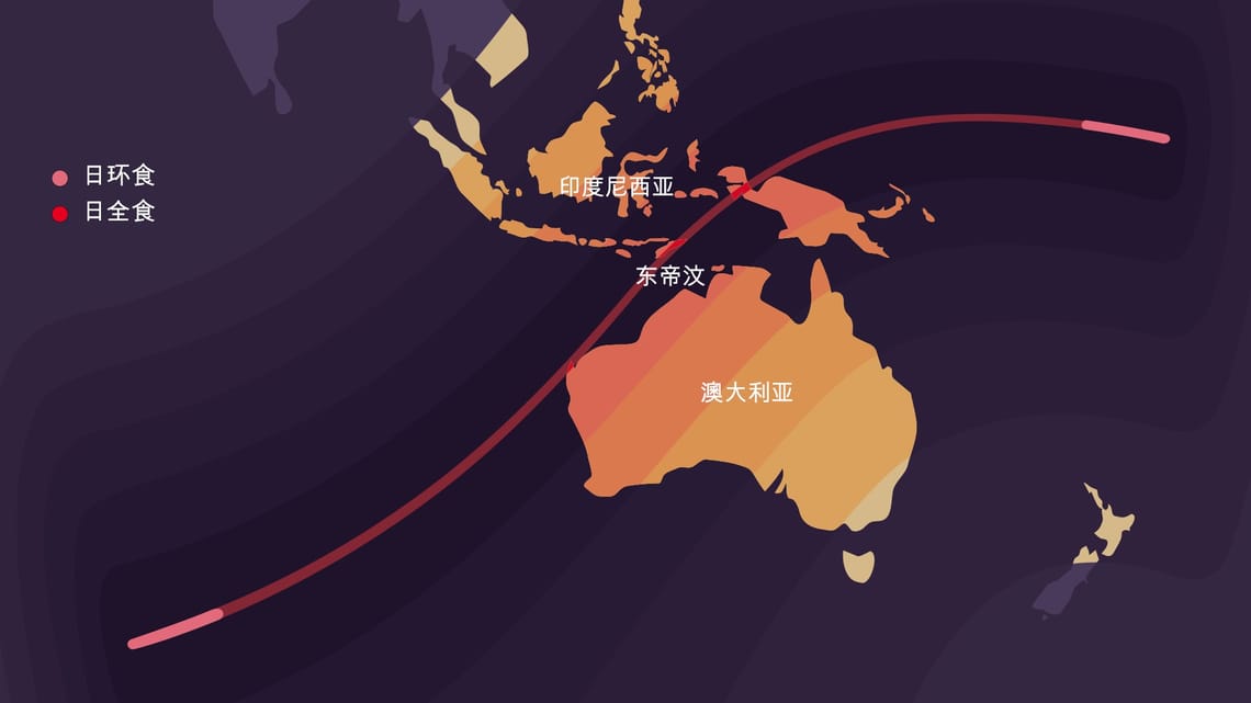 从东帝汶东部、西巴布亚部分地区和西澳大利亚的埃克斯茅斯(Exmouth)半岛可以看到日全食。