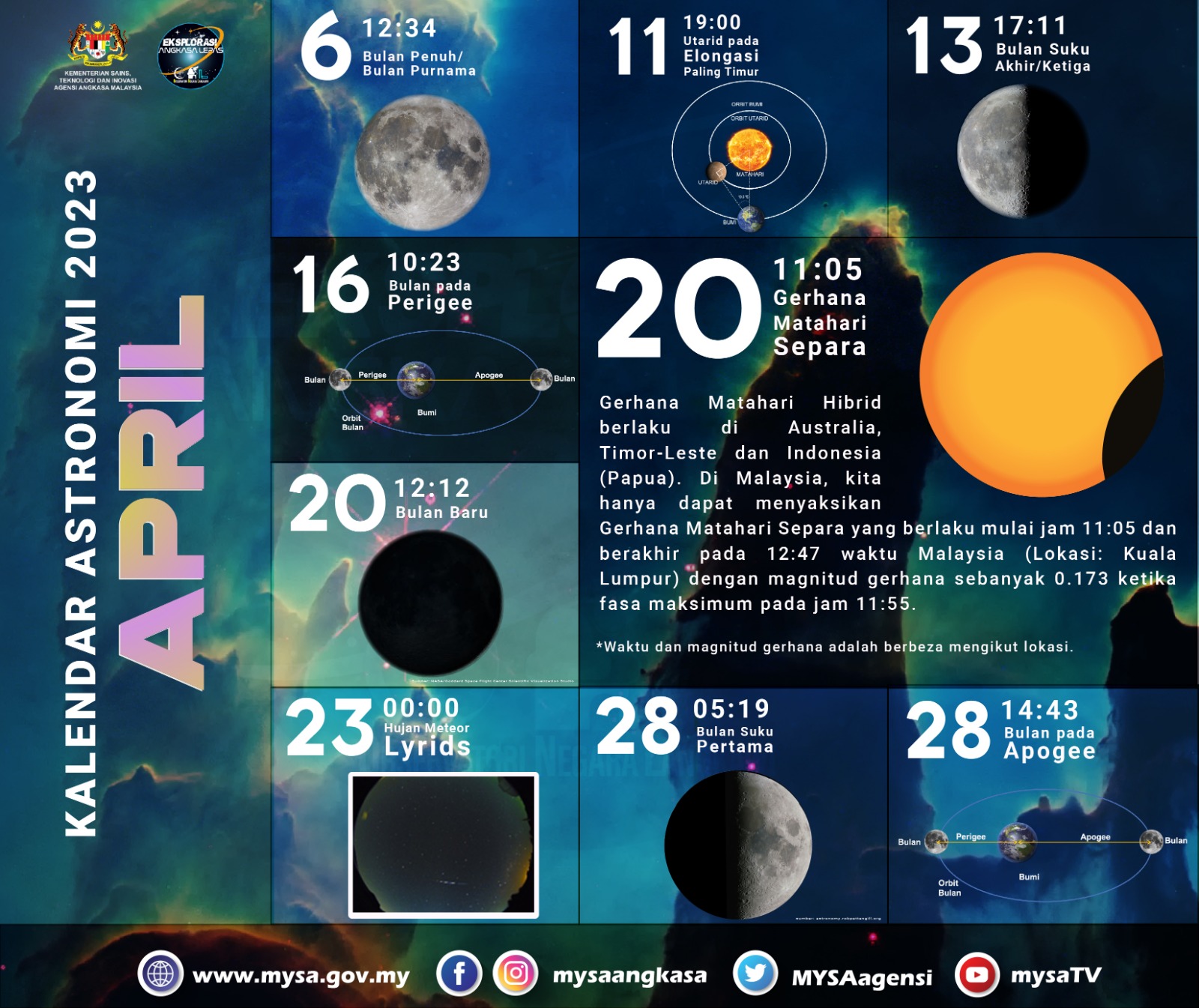 日偏食于4月20日(吉隆坡),时间上午11时05分开始,一直到12时47分结束,食甚(Maximum)时间在11时55分