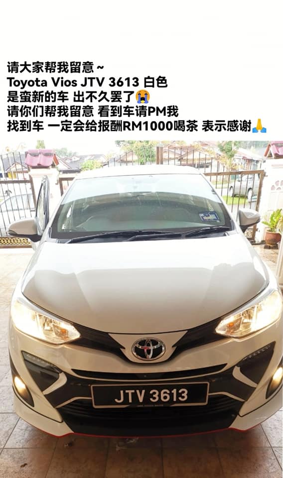 女屋主希望民众协助找到失窃的轿车,并愿意付予1000令吉作答谢。轿车车牌 JTV 3613。