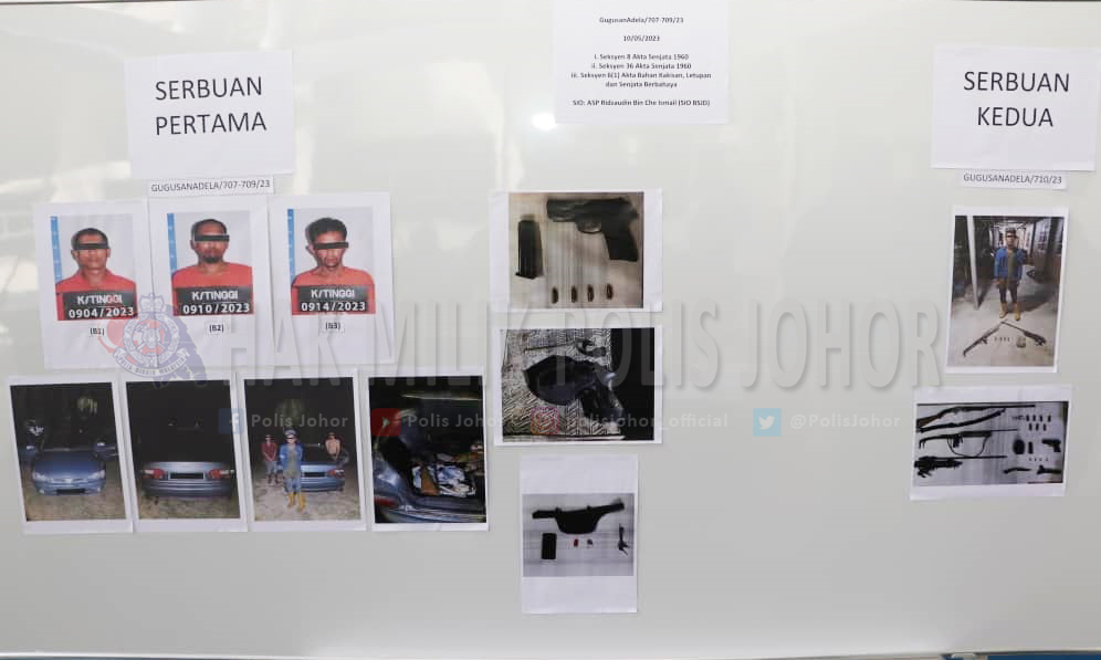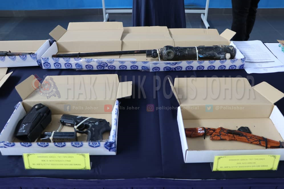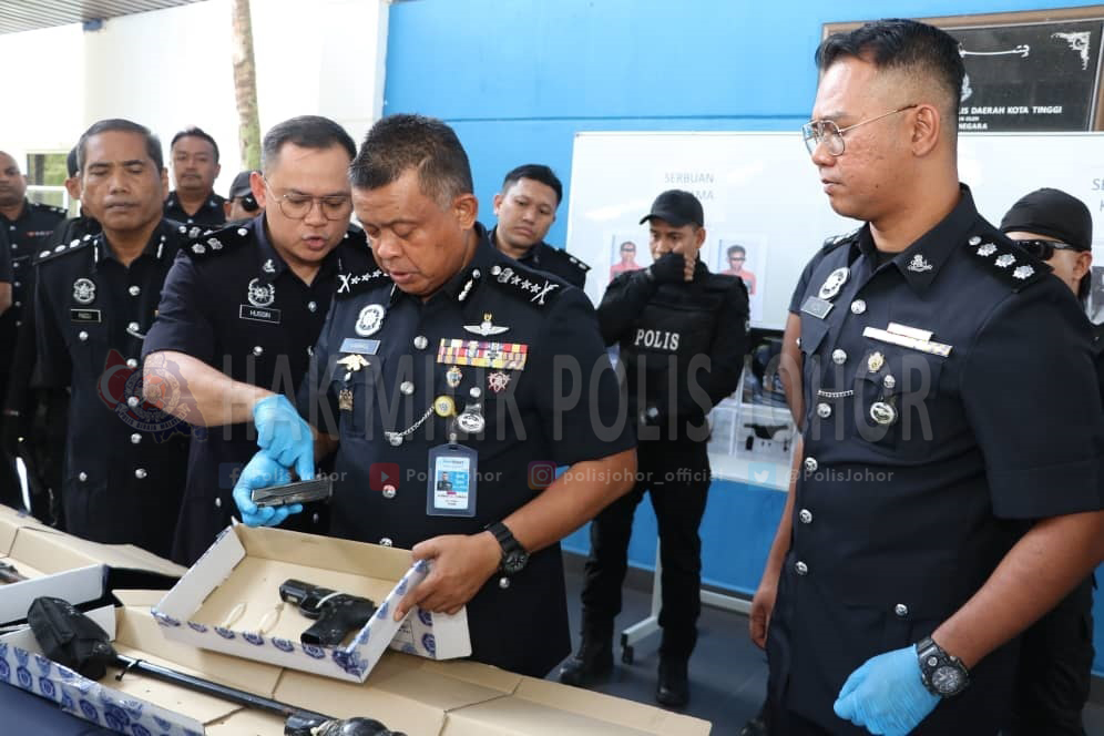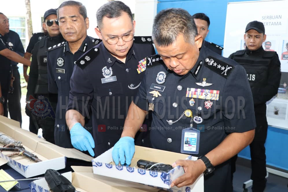 柔佛州总警长拿督卡馬鲁查曼昨日在哥打丁宜警区总部召开新闻发布会,公佈起獲一宗槍械案件。