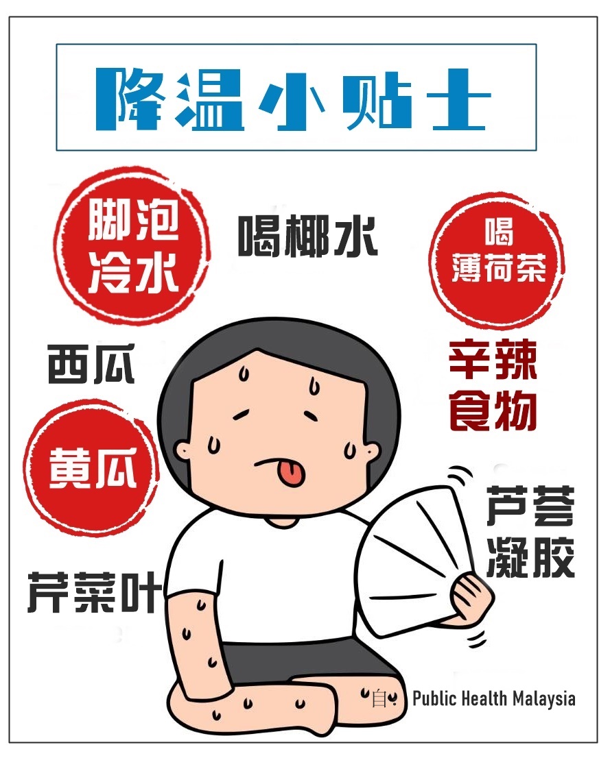 “马来西亚公共卫生”面子书昨日便分享降温妙招,双脚可泡冰水降温,也可多吃喝汤,摄入高水量的蔬果,并且用芦荟敷脸。
