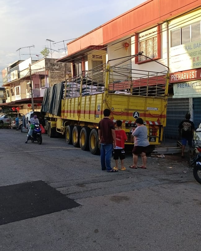 (古來25日訊)司機卸貨時,羅厘突然自行滑行,結果撞向店鋪前的6輛轎車。