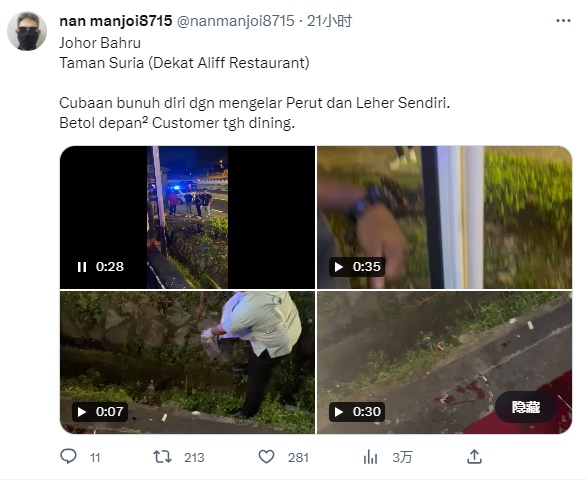 新山南警区主任拉勿在文告中指出,警方是于今早9时02分,收到通知指推特“NanManJOI8715”上载视频,指一名男子在餐馆前企图自杀。