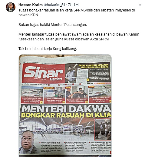 哈山卡林日前(1日)在推特留言,炮轰旅游、艺术及文化部长拿督斯里张庆信不应多管闲事,甚至滥权插手贪污课题。