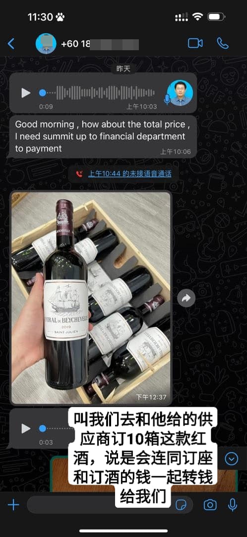 对方会发送红酒讯息给店家,也提供红酒供应商的号码,要求店家自行与供酒商接洽。