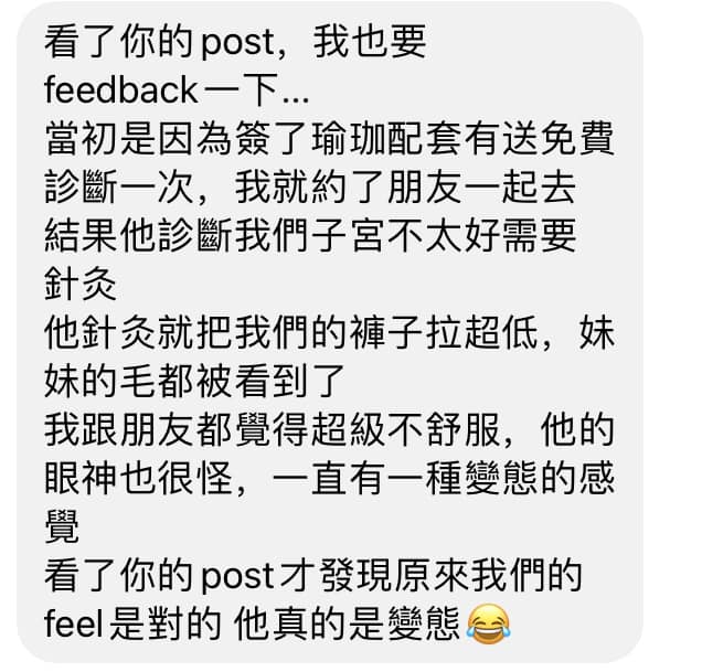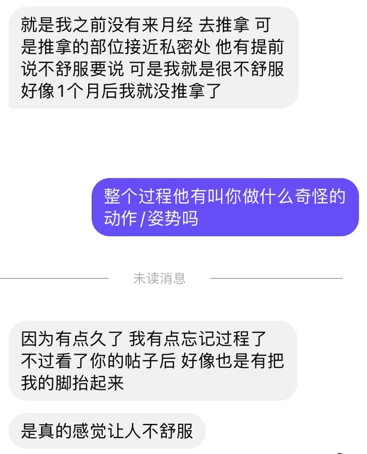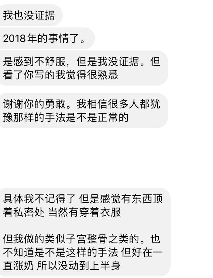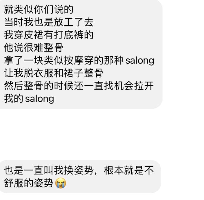 但是女网友Wei当时拒绝,并指这一次治疗竟长达3小时,而且推拿过程让她很不舒服,因为很多动作都是很奇怪的动作。