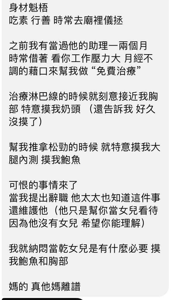 她除了揭露自己的遭遇,也上载另3名受害者的经历,希望就中医在治疗时不耻行为,能受到关注而严厉对付。