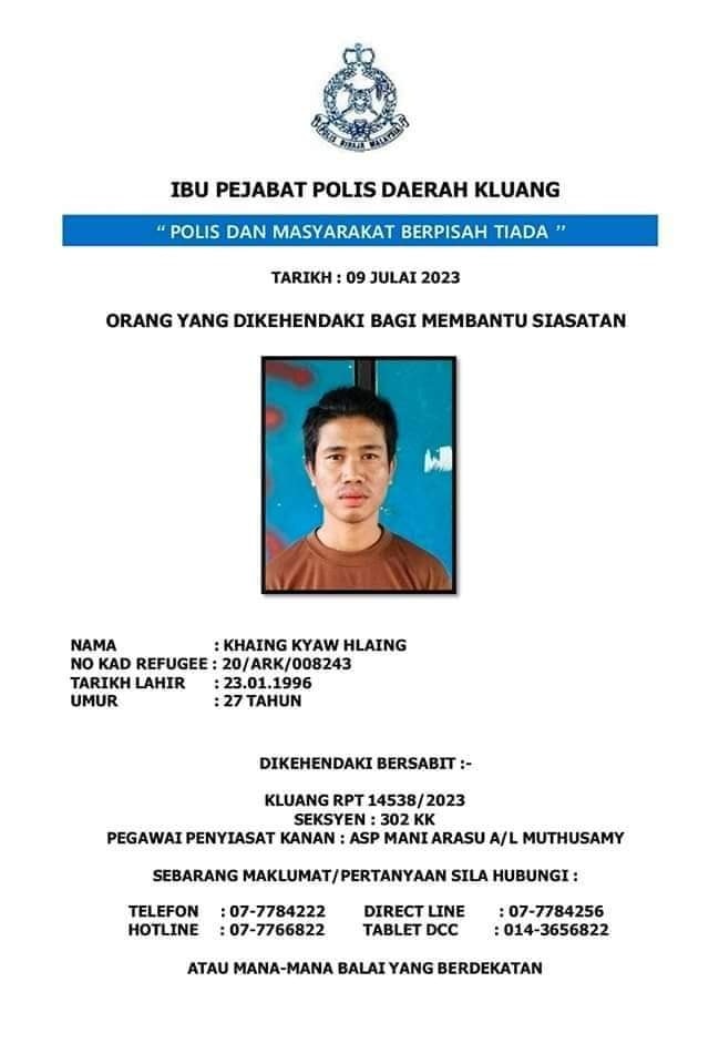唯27岁的主嫌犯已逃脱,警方发通告追缉对方,任何有消息者可致电警方投报:07-7784222、07-7766822。