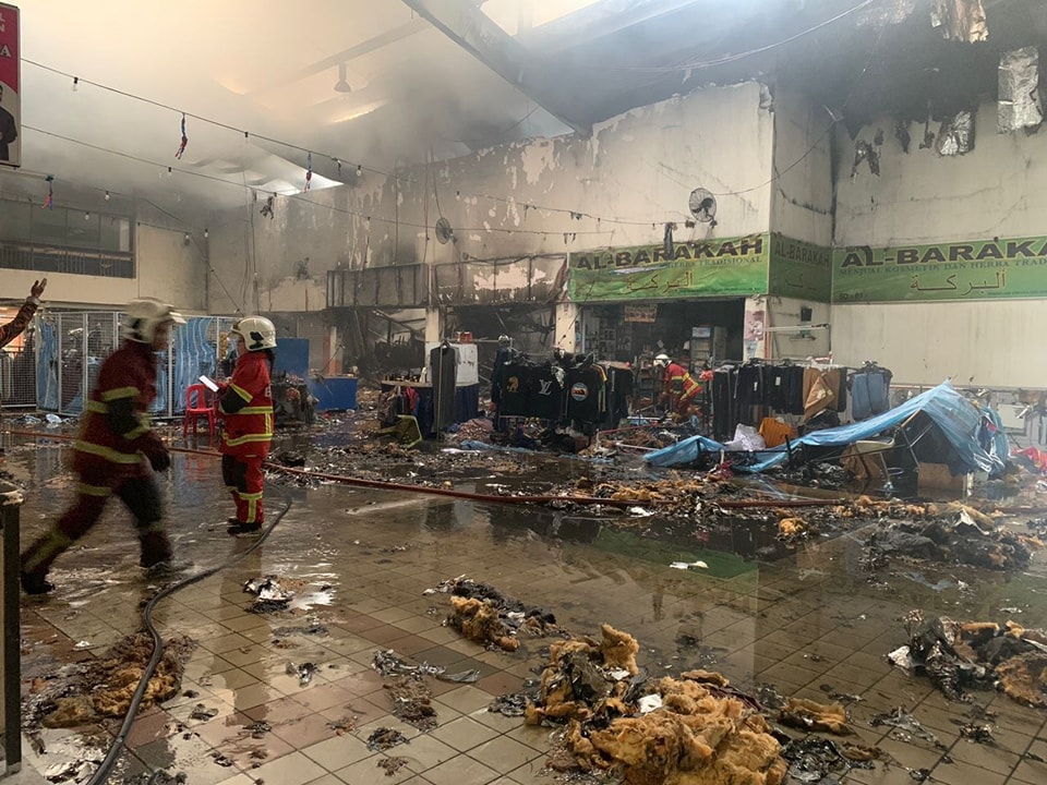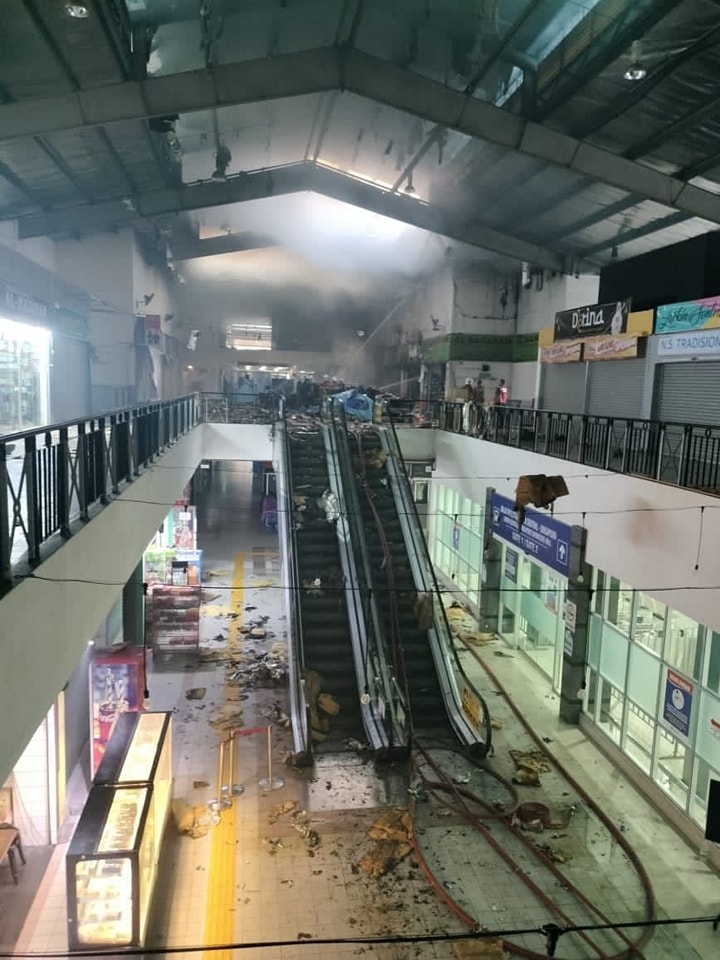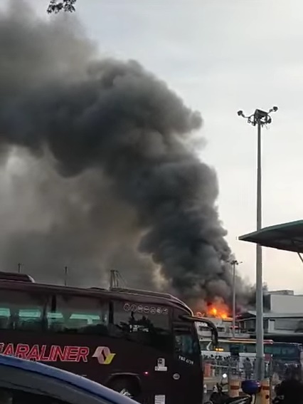 (新山23日讯)拉庆中央车站(Larkin Sentral)燃起熊熊大火,4间店被波及,一片狼籍。