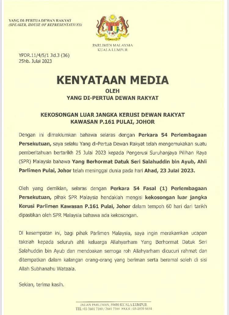 今日(25日)国会下议院议长丹斯里佐哈里阿都根据宪法第54(1)条,发出正式公函和通知选委会,指埔莱国会议席因为拿督斯里沙拉胡丁阿育逝世,导致议席悬空。