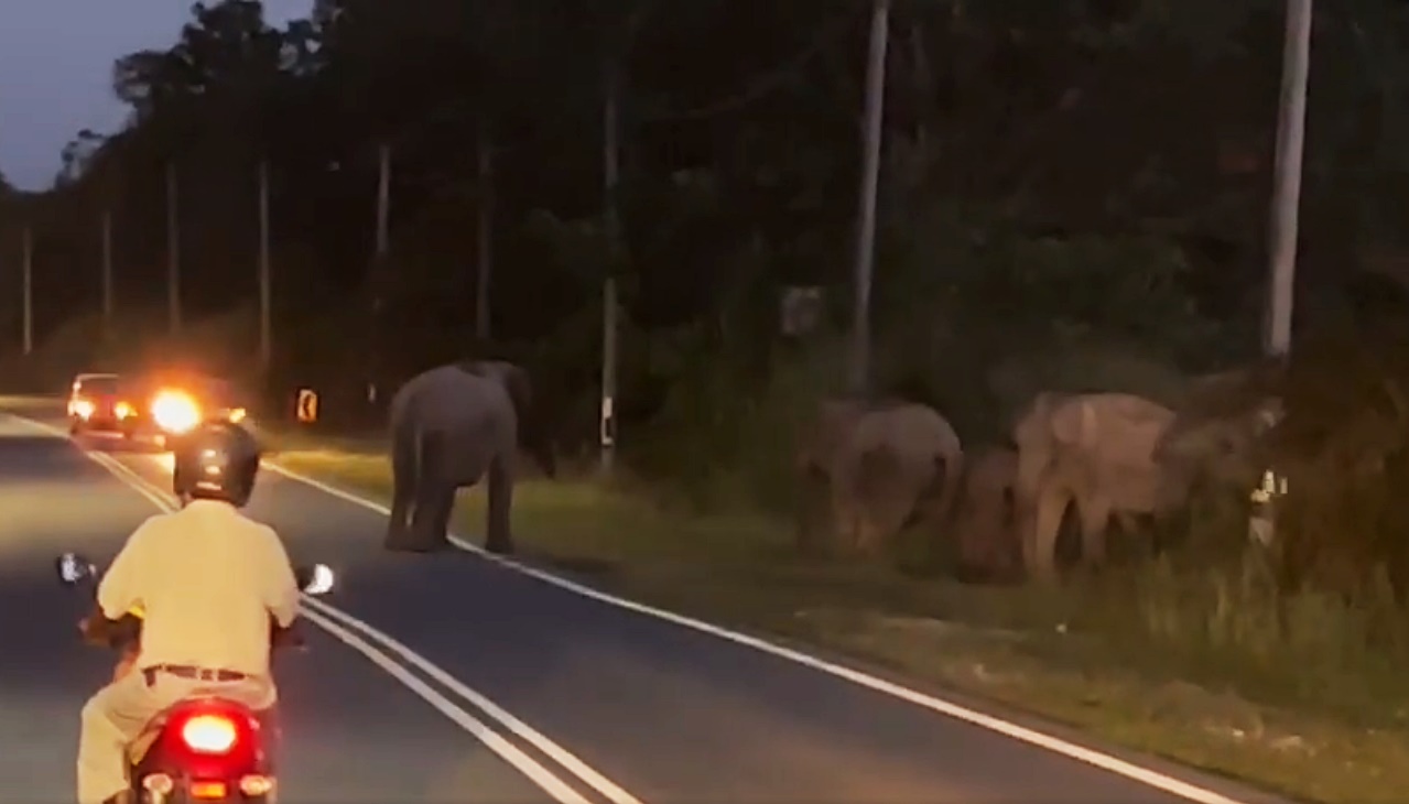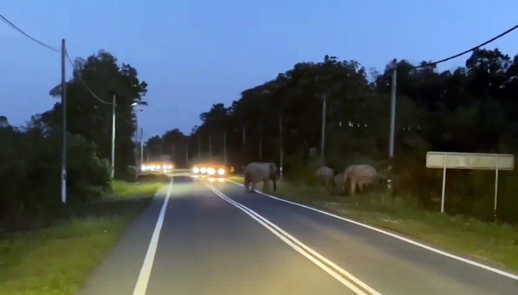 社会时事 逾十头野象聚集路边 车辆不敢前驶 无奈排长龙 2023 年 7 月 25 日2023 年 7 月 25 日 (居銮25日讯)约15头大象聚集在路边,吓得轿车都不敢向前行驶。 网上流传,今晚约7时45分,有一群为数15只的大象群出现在公路上。 网友提供的消息地点位于哥打丁宜路一带。 43秒视频可见,由于野象在路边停下,以致车辆也不敢随便驶前越过象群,只能排长龙等候。 之后只见一只野象缓缓越过大路,其他野象未见“动身”,让道路使用者不知所措。 这情景,估计交警来了也没辙吧? ↓↓最近新闻↓↓ 分享 Facebook Twitter Pinterest Linkedin