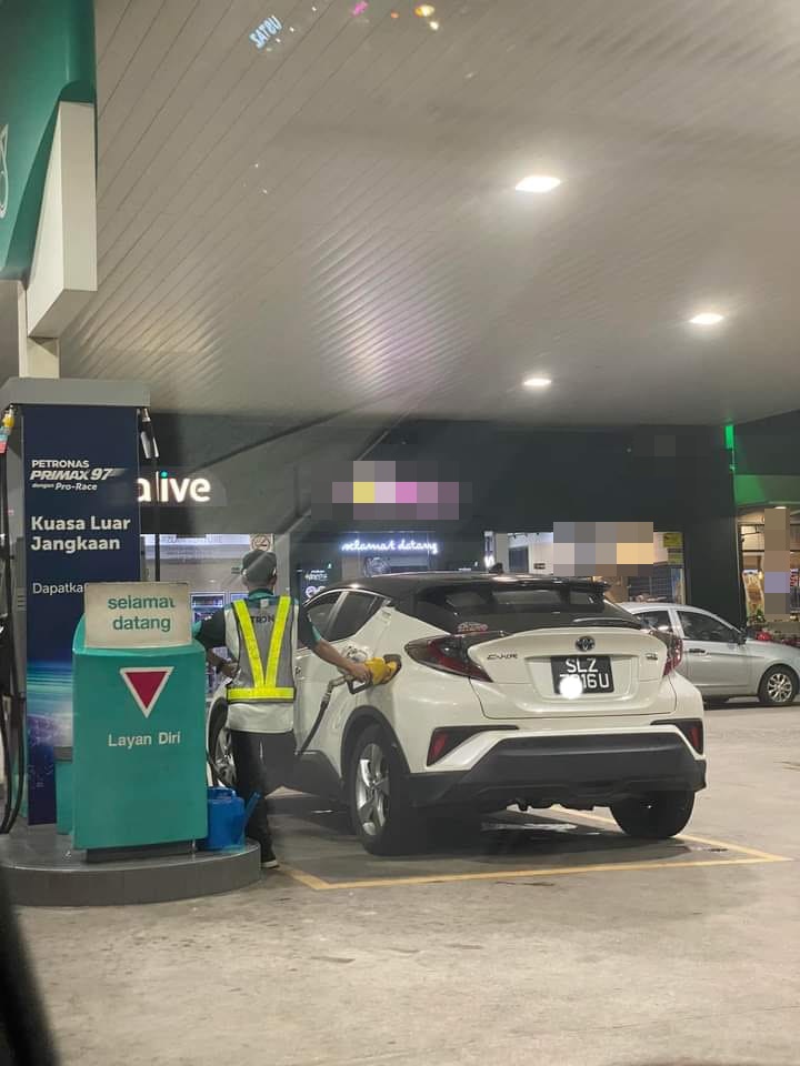 面子书专页“Ehailing.fm”日前( 4日)分享在某油站内,一名油站员工替一辆新加坡注册轿车,添加“黄枪”汽油,如政府补贴的RON95汽油。