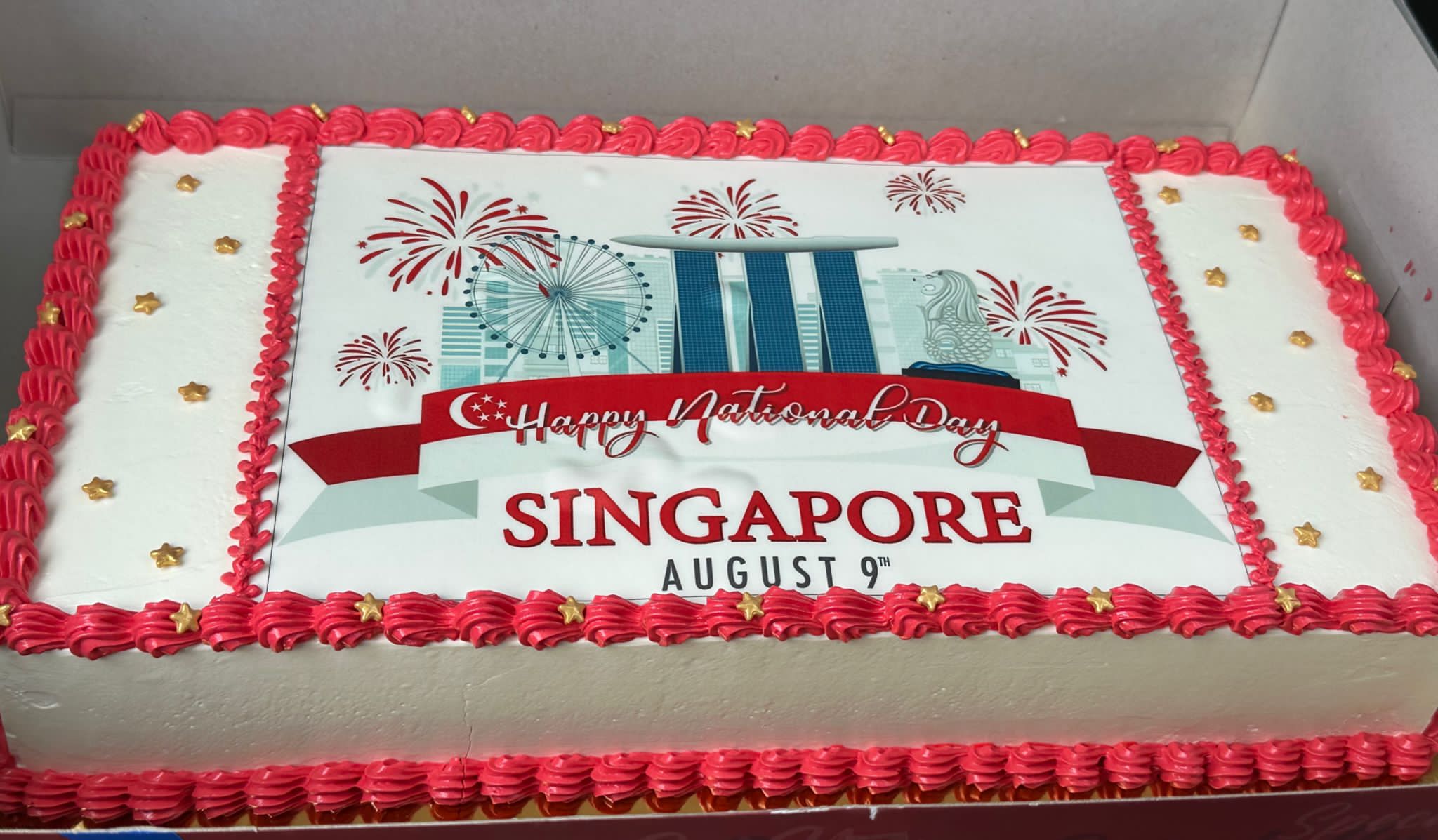 蛋糕设计以新加坡国旗红白色为主,还可见新加坡地标如鱼尾狮、滨海湾金沙和新加坡摩天观景,加上朵朵烟花很喜庆。